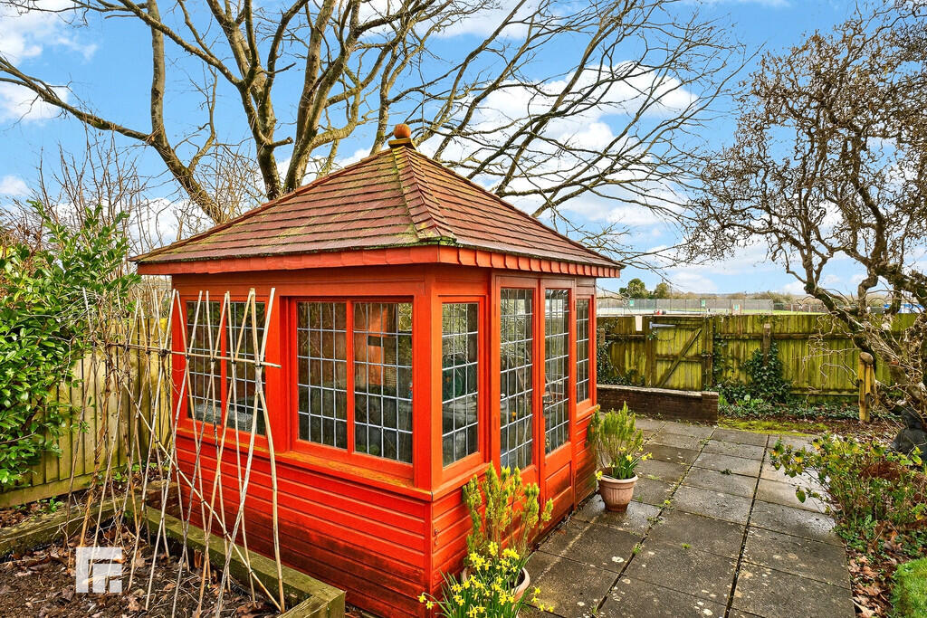 REARGARDEN A delightful and beautifully presented rear garden approached via double French doors to paved patio. A large area of lawn with large oak tree. Paved patio path leading to additional patio area. To the right hand side a pergola with swinging bench. A range of mature shrubbery through the garden. Garden shed. Enclosed by wooden fencing. Outside tap. Wooden side gate leading to front entrance.