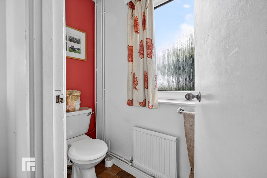 CLOAKROOM Comprising low level wc and wash hand basin. Tiled flooring. Obscured glass window to rear.