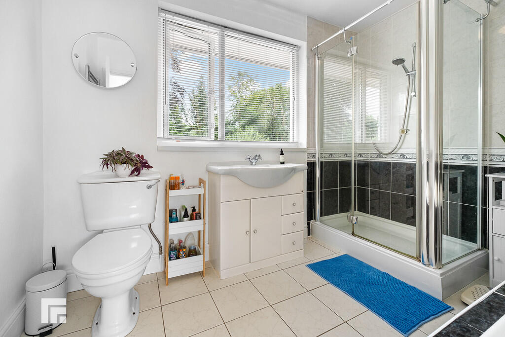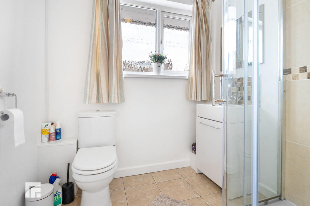 EN-SUITE Obscured double glazed uPVC window to front. Tiled floor. Tiled shower cubicle with mains shower, vanity enclosed wash hand basin with mixer tap, w.c.