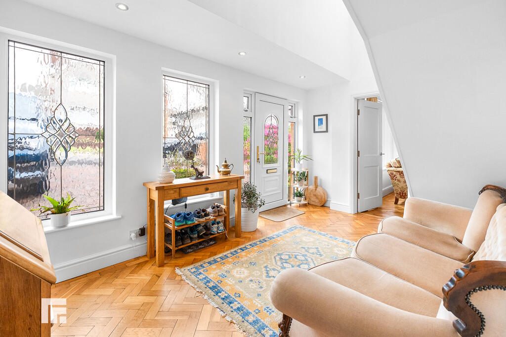 ENTRANCEHALL Entered via obscured glazed double glazed uPVC door with obscured double glazed panels either side. 2 obscured double glazed windows to front. Spotlights. Original Wood panelled flooring. Radiator. Stairs to first floor. Cloak cupboard. Door to :-
