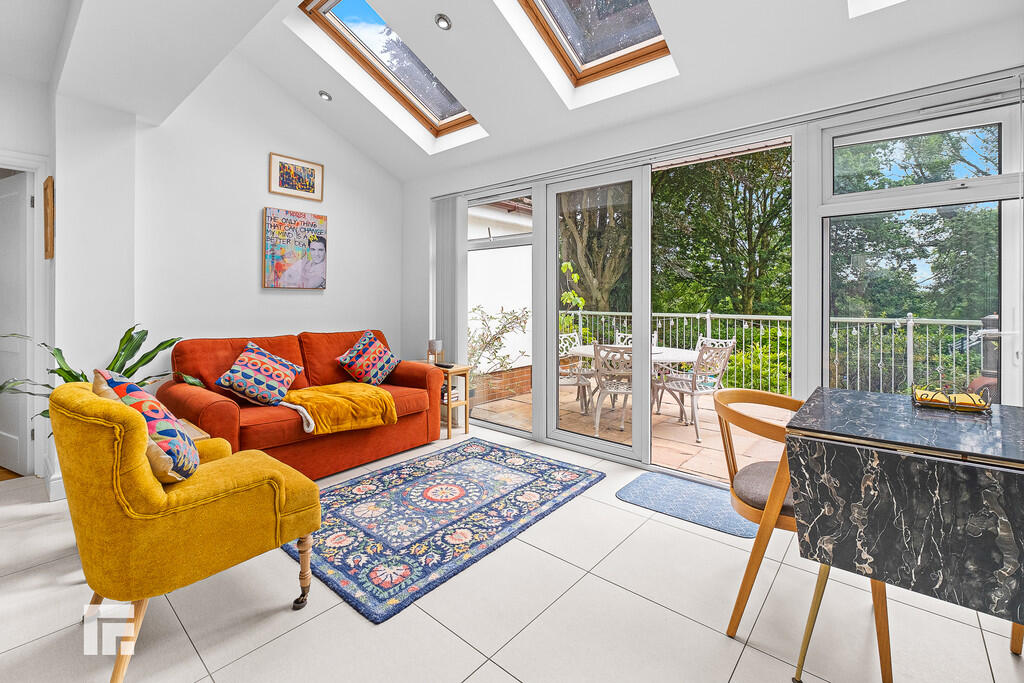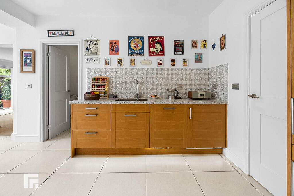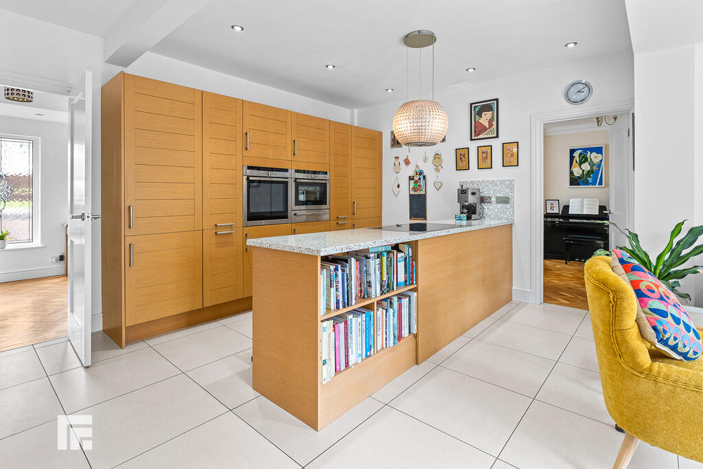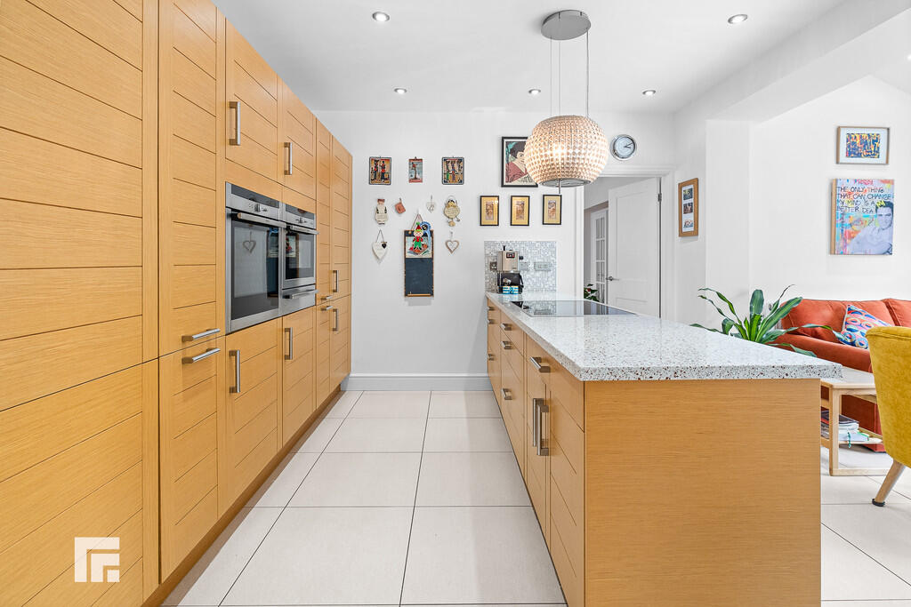 KITCHEN/DINER19' 6" x 17' 3" (5.95m x 5.27m) Double glazed uPVC windows and French doors to rear garden. 3 velux skylights. 2 radiators. Mandarin stone tiled floor. Bespoke Mobalpa French oak kitchen with silestone work surfaces and porcelanosa tiled splash backs incorporating one and a half Franke stainless steel sink unit with filtered water tap. Central peninsula with "Neff" induction hob and Elica Crystal extractor over and with ample storage below. Further Neff appliances to include full size fridge, fan oven, steam oven and warming tray, dishwasher and freezer.