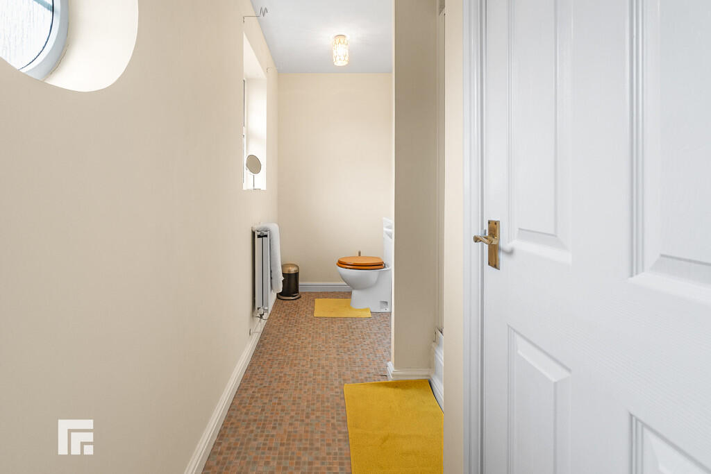 CLOAKROOM4' 11" x 2' 11" (1.50m x 0.90m) White suite; low level WC, pedestal wash hand basin with twin chrome taps. Radiator. Tiled splashback and flooring. Obscured glass window to side.