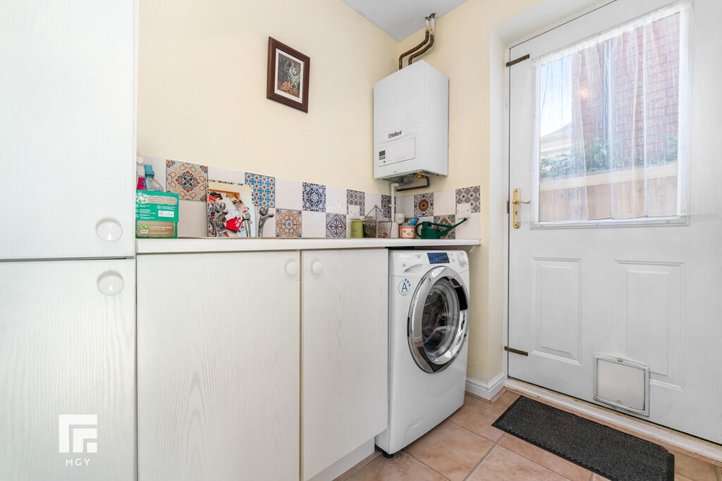 UTILITYROOM7' 4" x 4' 11" (2.25m x 1.52m) Utility room with single bowl stainless steel sink, dual chrome taps and drainer, white cupboards and worktop. Plumbing for washing machine. Wooden door to side leading into garden. Tiled splashbacks and flooring. Loft access with storage area.