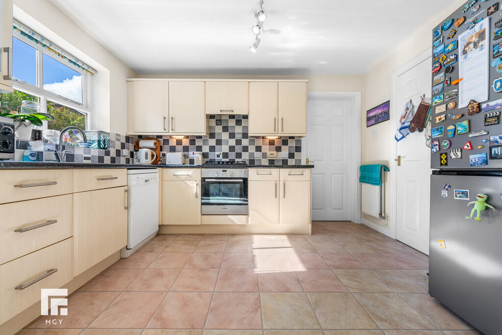 KITCHEN16' 5" x 9' 0" (5.01m x 2.76m) Appointed along two walls, a light wood effect kitchen with eye and low level cupboards. One and a half bowl stainless steel sink with drainer and chrome mixed tap, integrated four ring gas hob and oven, extractor hood, space for fridge freezer, space for dish washer. An additional free standing kitchen unit. Space for dining room table. Laminate worktops. Tiled flooring and tiled splashbacks. Two radiators. Doubled glazed window. uPVC French doors opening into the well maintained, large rear garden. Door to utility room.