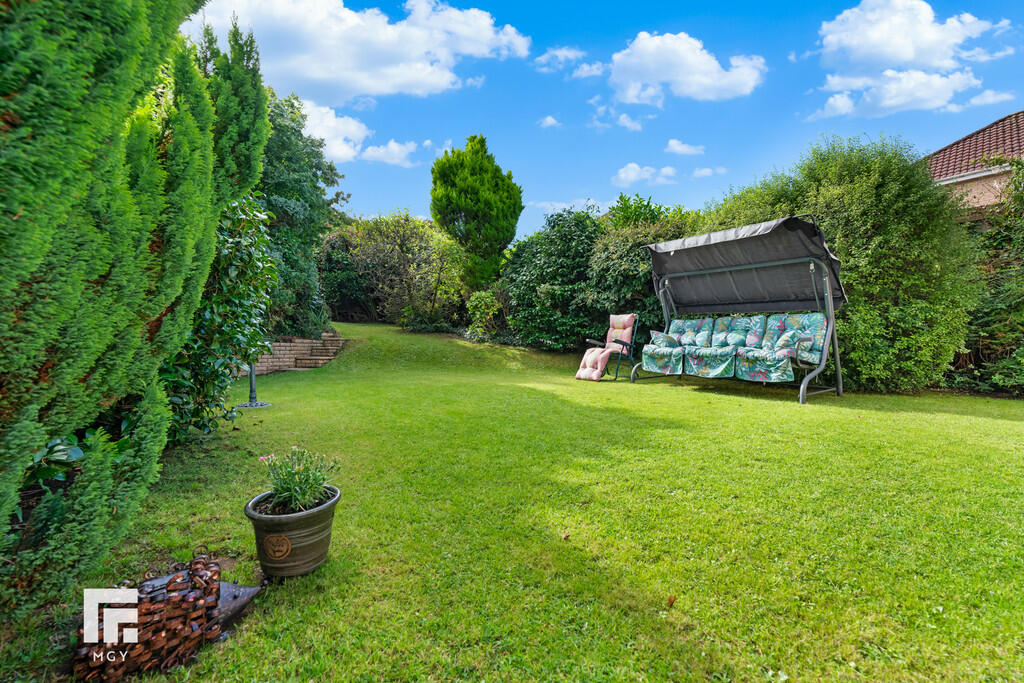 REARGARDEN A beautifully presented, well maintained, large rear garden. Enclosed by mature trees and shrubs and bordered by a timber fence. Paved patio area, with large lawn area. Timber gate for side access. Small shed to side.
