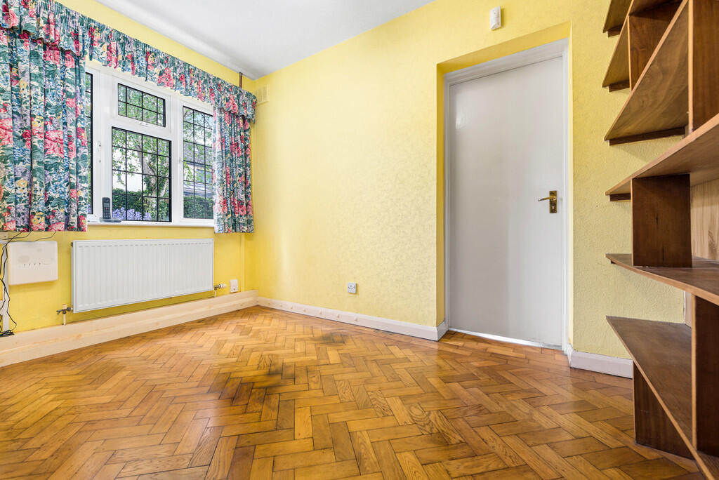 STUDY7' 6" x 10' 7" (2.304m x 3.238m) uPVC double glazed window to side. Fitted shelving. Original parquet flooring. Radiator. Door to dining room.