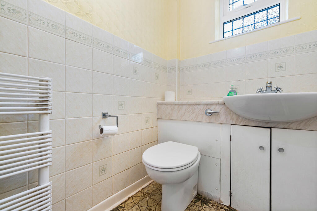 WC3' 8" x 5' 8" (1.142m x 1.728m) uPVC obscure double glazed window to side. Vanity unit with inset sink and cupboards below. Back to wall wc. Part tiled walls. Tiled floor. Heated towel radiator.