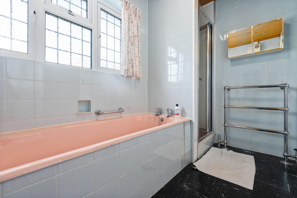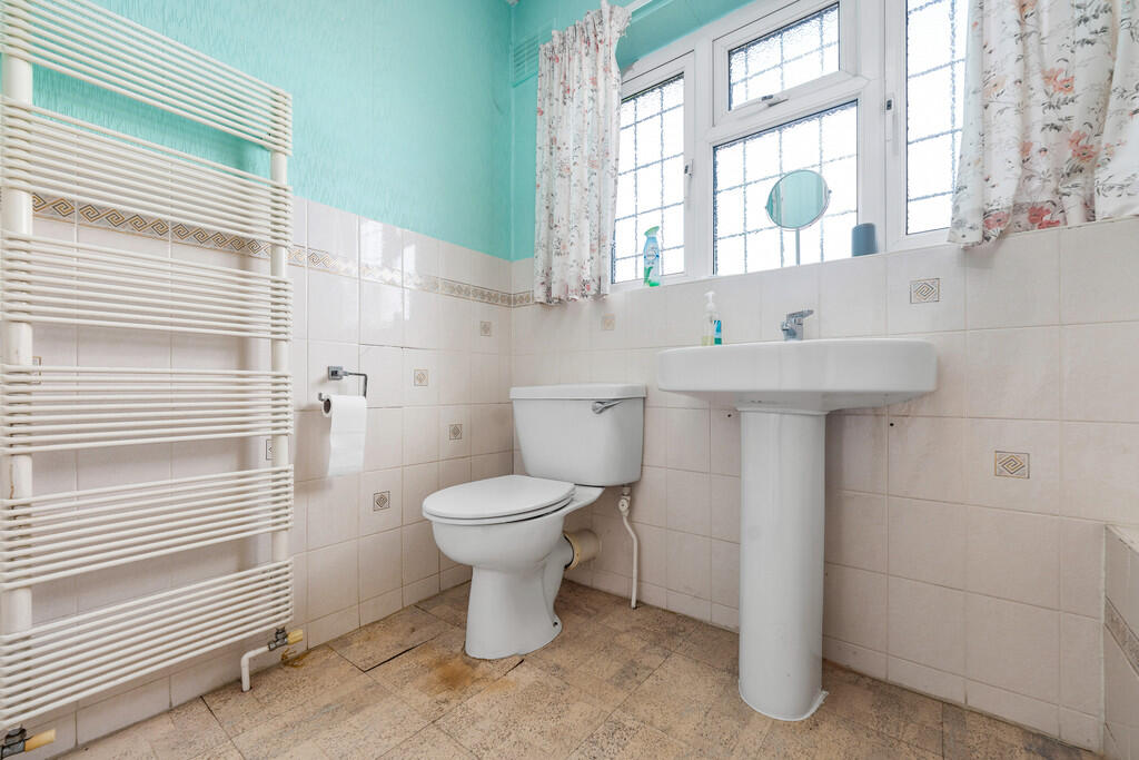 BATHROOMONE5' 0" x 9' 4" (1.547m x 2.854m) uPVC obscure double glazed window to side. Panelled bath. Pedestal wash hand basin. Separate shower cubicle. Heated towel radiator. Fully tiled walls.