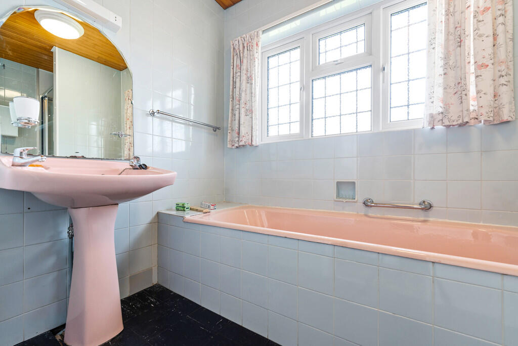 BATHROOMTWO7' 8" x 5' 2" (2.346m x 1.577m) uPVC obscure double glazed window to side. Panelled bath with shower over. Pedestal wash hand basin. Low level wc. Heated towel radiator. Part tiled walls.