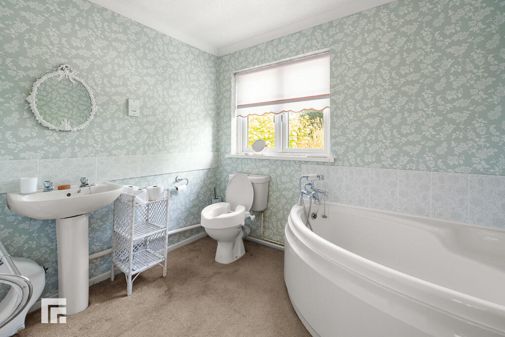 BATHROOM Double glazed window to the rear. Suite to comprise corner bath, closed cistern w.c and wash hand basin. Fitted carpet. Ceramic tile splash back areas.