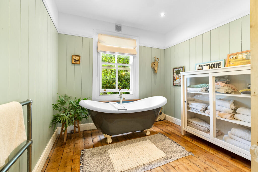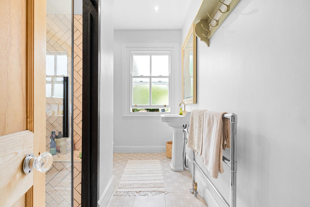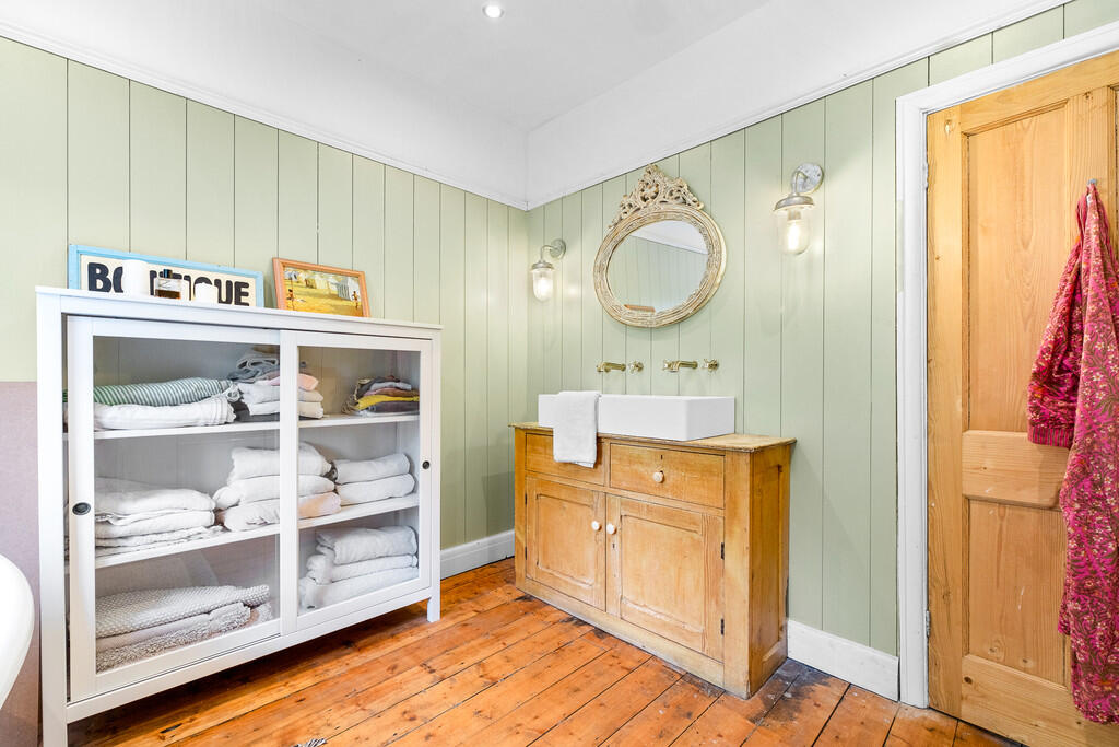 ENSUITEBATHROOM9' 10" x 8' 11" (3.00m x 2.72m) A beautifully presented traditional style suite with freestanding claw legged roll top bath and large vanity wash basin with storage below. Sash cord window overlooking the delightful rear garden, enjoying bath tub views. Wood flooring. Heated towel rail.
