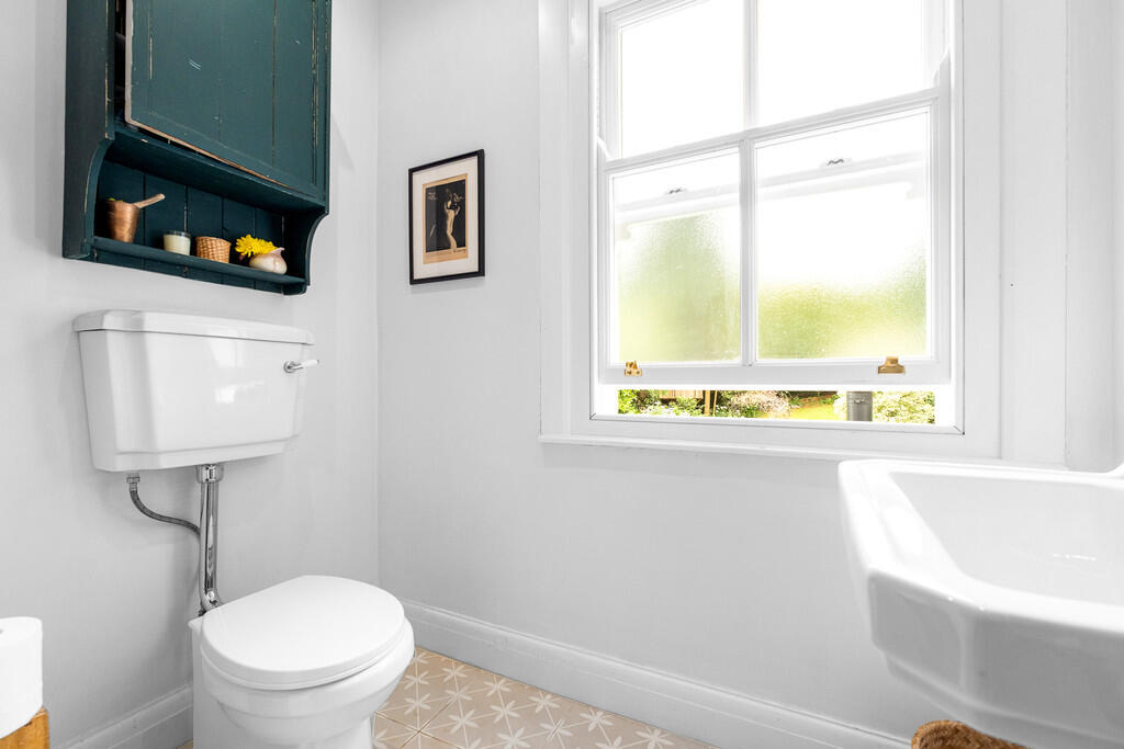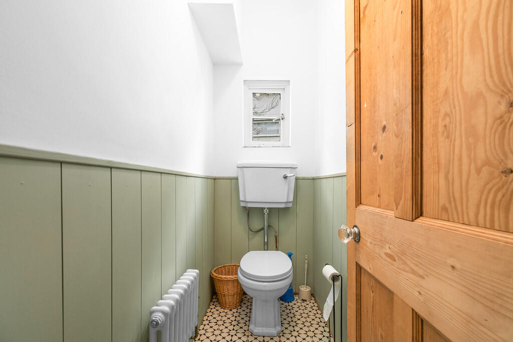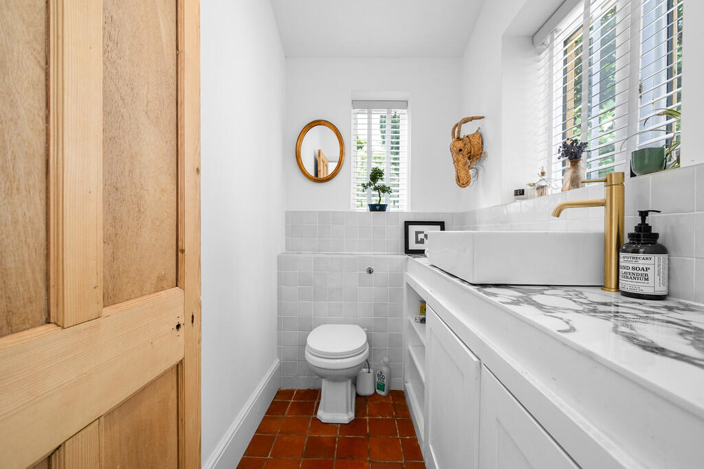 CLOAKROOM Comprising low level wc and ceramic wash hand basin with storage below. Tiled work surface and splash back. Tiled flooring. Windows to rear.