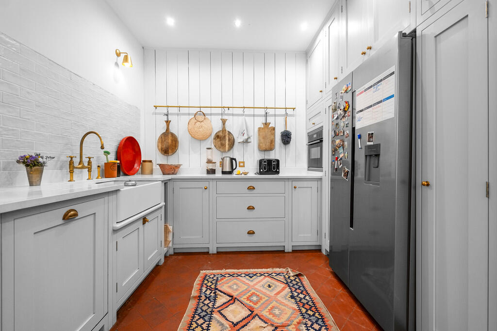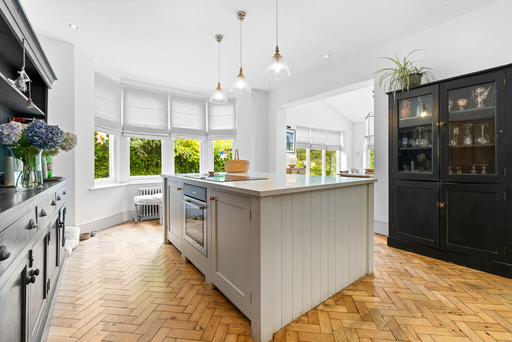 KITCHENANDBREAKFASTROOM24' 7" x 13' 3" (7.50m x 4.05 into baym) Well appointed along three sides in 'cashmere' coloured panelled fronts beneath quartz worktop surfaces. Inset 2 bowl ceramic sink with worktop side drainer. Integrated oven. Space for American style fridge freezer. Integrated dishwasher. Large central breakfast bar island with matching units and quartz worktop. Inset five ring induction hob with oven below. Abundance of storage. Worktop breakfast bar area. Bay window to side. Part tiled, part woodblock flooring. Reclaimed traditional column radiator. Large open into the dining and family room.