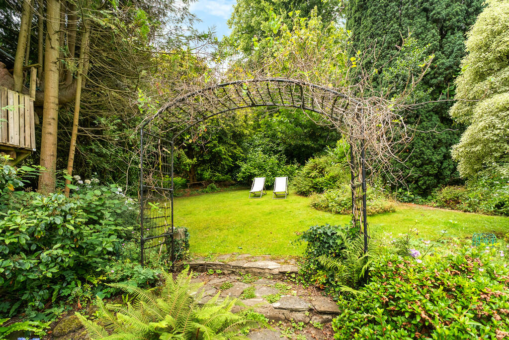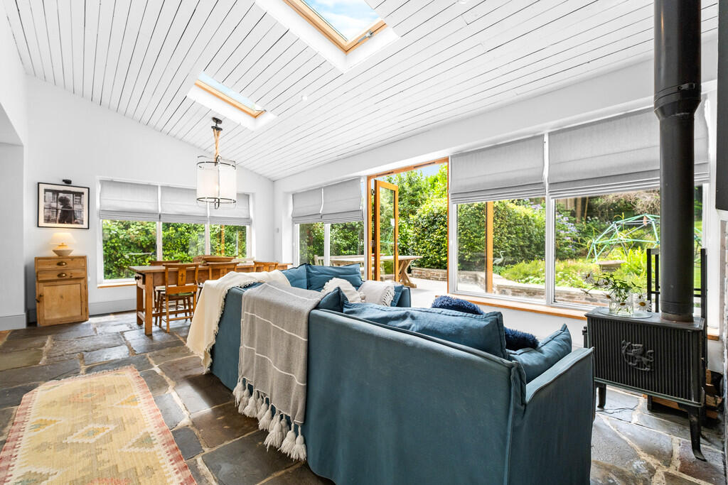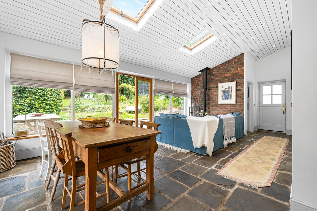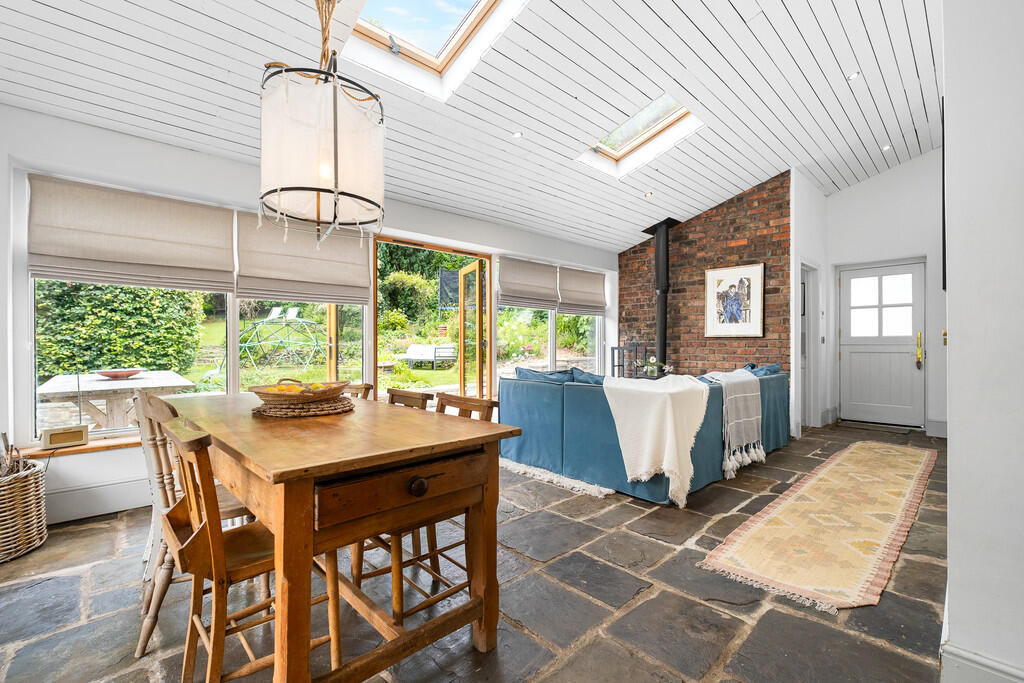 DININGANDFAMILYROOM25' 5" x 11' 10" (7.77m x 3.61m) A delightful rear extension with windows overlooking the exceptional rear garden. French doors to rear patio. Slate flooring with under floor heating. Vaulted ceiling with windows to rear pitch. Door to side. Alcove with storage and hanging rail. Inset ornate cast iron wood burner. Door to cloakroom.