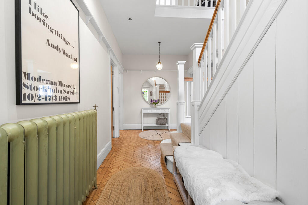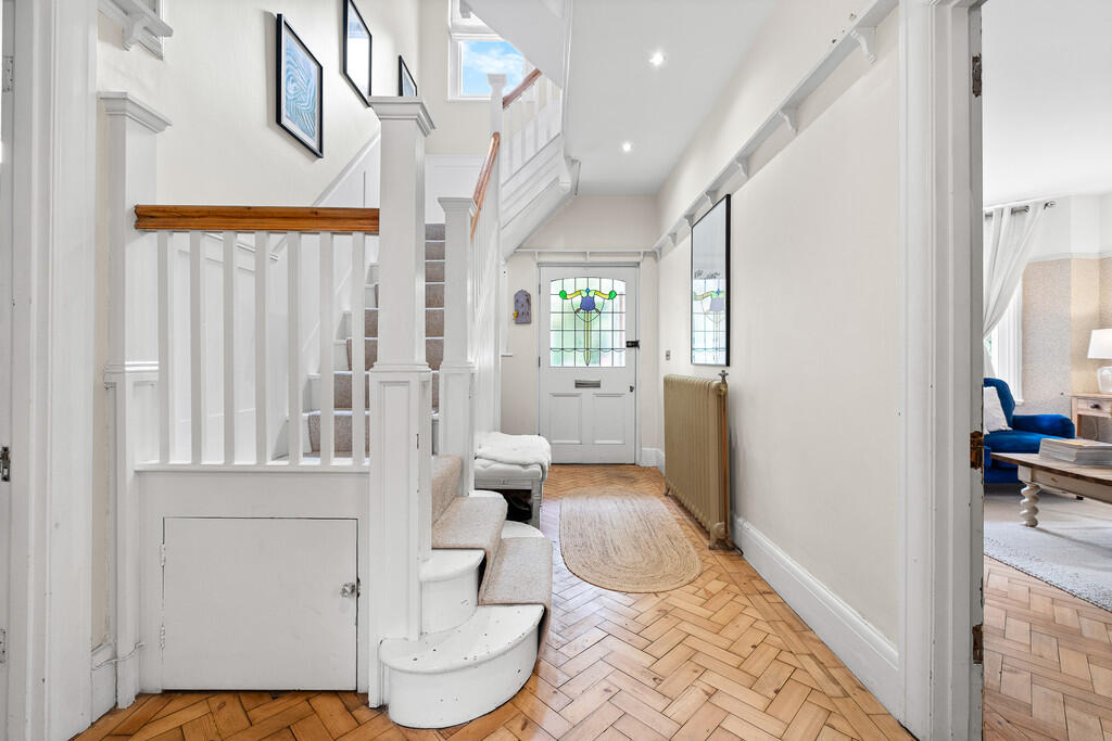 ENTRANCEHALLWAY Approached via an original wood panelled entrance door with stain glass window to upper part leading to the spacious entrance hallway. Staircase to first floor with under stairs storage cupboard. wood block flooring. Reclaimed traditional column radiator.