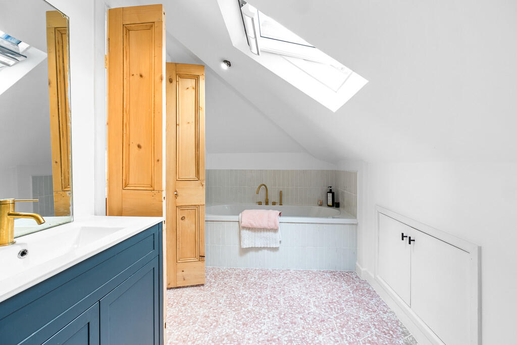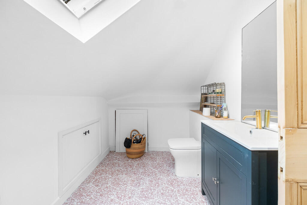 ENSUITEBATHROOM12' 10" x 6' 0" (3.92m x 1.85m) Quality white suite comprising low level wc, vanity wash basin with storage below. Tile panelled bath with central taps and shower mixer. Terrazzo effect hexagon tiled flooring. Eaves storage. Window to side pitch.