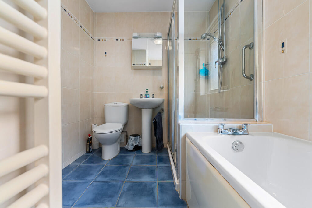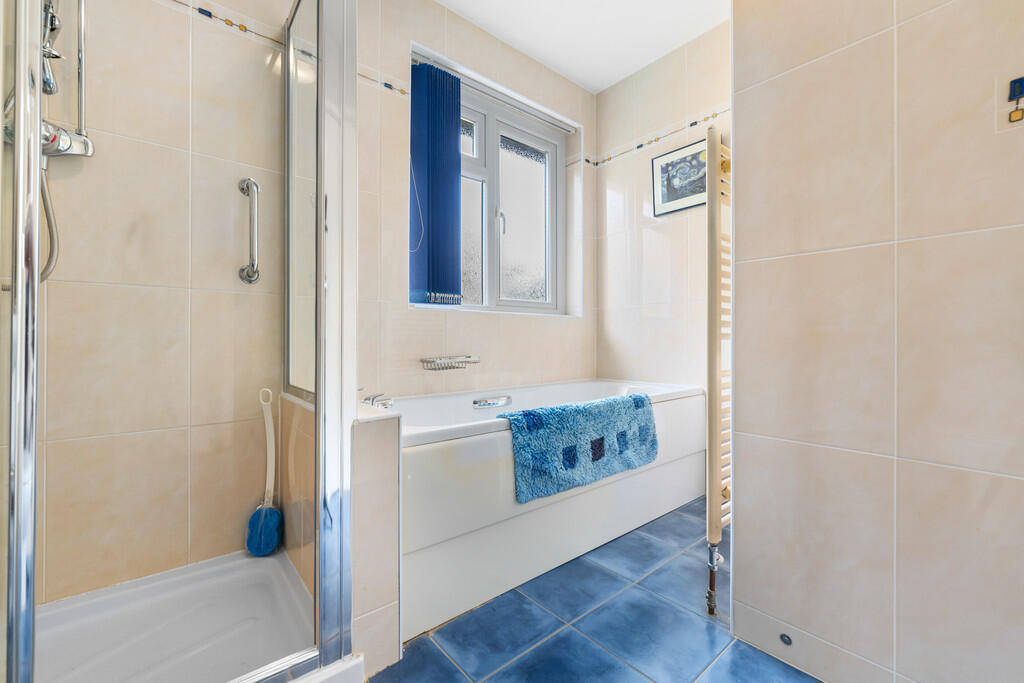 FAMILYBATHROOM9' 4" x 6' 6" (2.86m x 1.99m) Modern suite comprising low level wc, wash hand basin, shower cubicle and separate bath. Window to rear. Tiled flooring with underfloor heating. Full wall tiling. Heated towel rail.