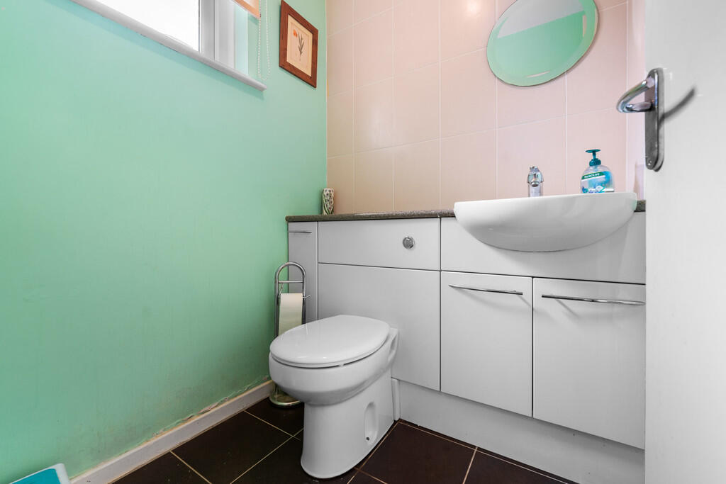 CLOAKROOM White suite comprising low level wc, vanity wash basin with storage below. Tiled flooring. Window to front.
