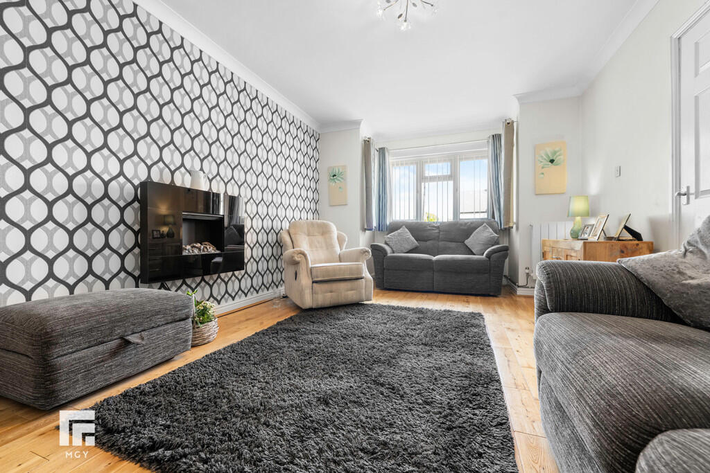 LOUNGE11' 2" x 18' 2" (3.423 m x 5.544m) Coving. PVC bay window to front aspect. Two radiators. Electric fire.