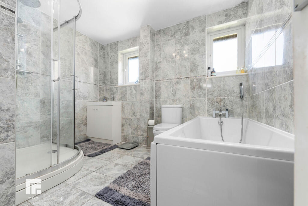 BATHROOM9' 0" x 9' 9" (2.747 m x 2.993 m) Tiled walls.Two PVC windows with obscure glass side aspect. WC with inset flush. Bath unit. Shower unit. Wash hand basin vanity unit. Ladder style radiator.