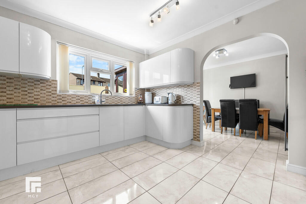 KITCHEN11' 11" x 11' 7" (3.657 m x 3.547 m) PVC window to rear expect. Part tiled walls. Coving. Archway entry into dining room. A range of base and wall mounted cabinets with contrasting square edge countertops. stainless steel sink. range gas cooker with gas hob, extractor fan set above.
