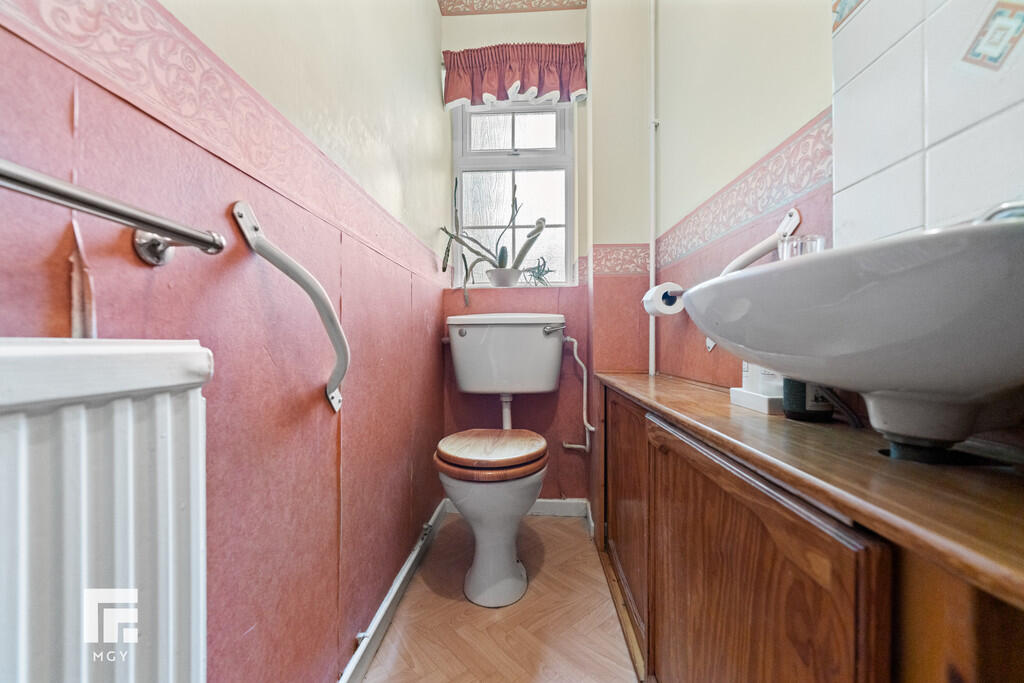 CLOAKROOM Comprising low level wc, wash hand basin. Obscured glass window to rear. Radiator.