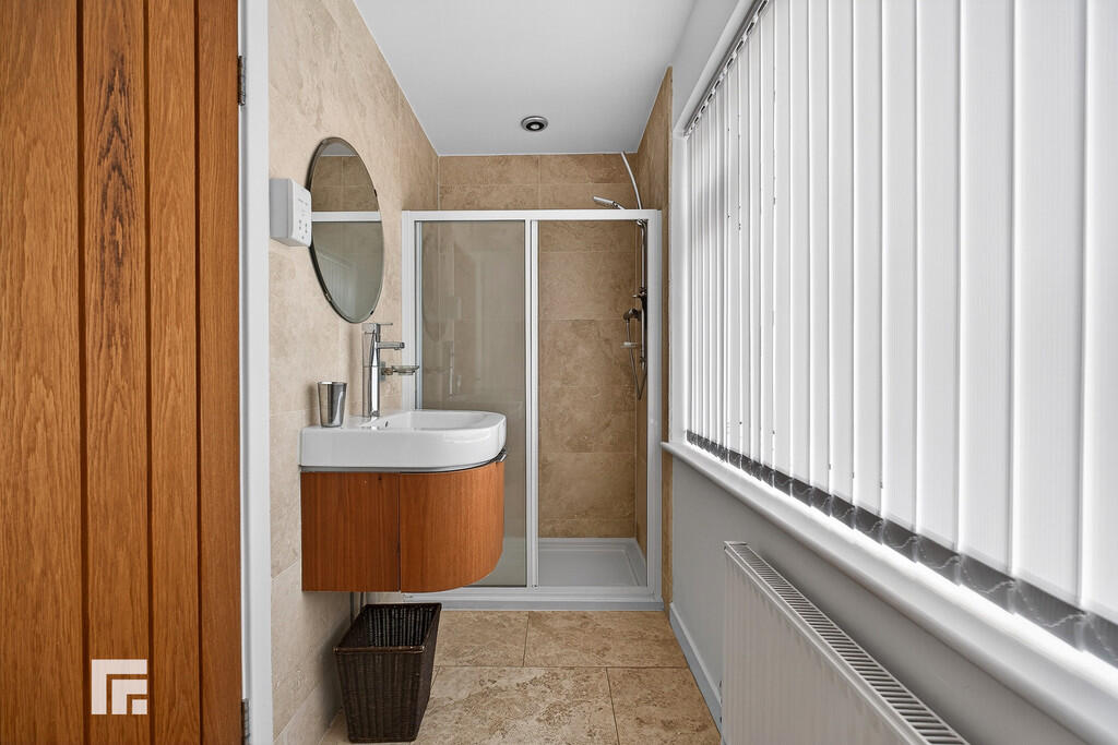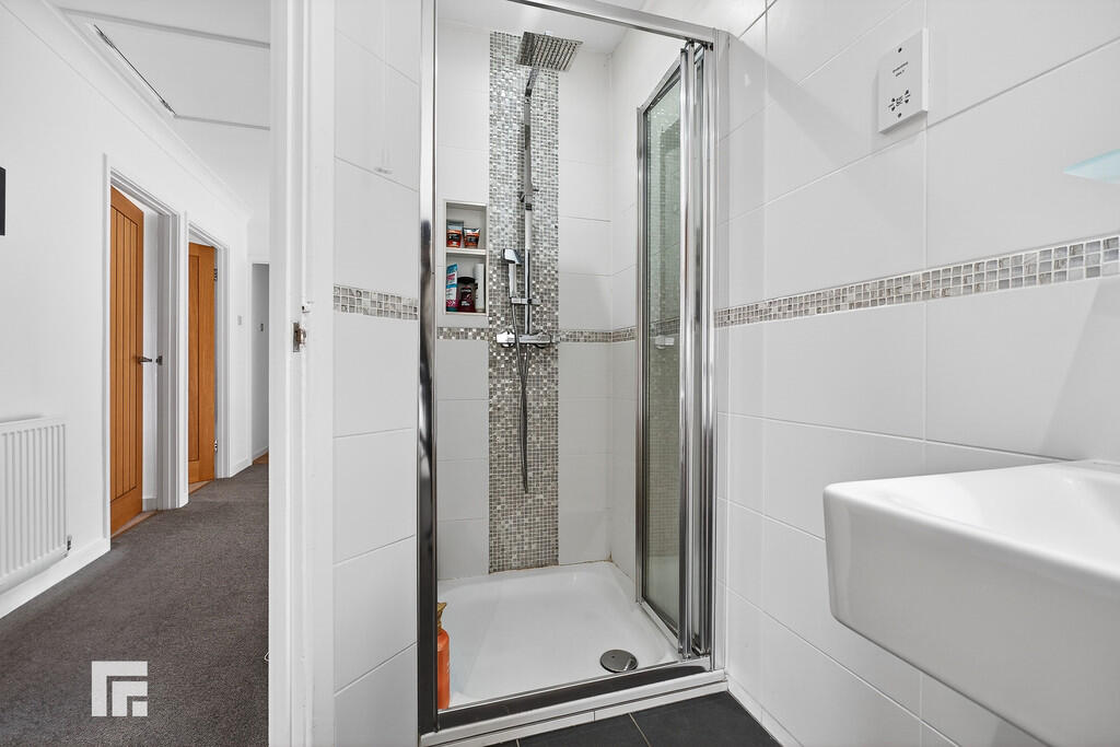 ENSUITE12' 6" x 4' 0" (3.82m x 1.23m) Modern white suite comprising low level wc, wash hand basin and shower cubicle with chrome shower above. Tiled walls to splash back areas. Tiled flooring. Window to front. Radiator.