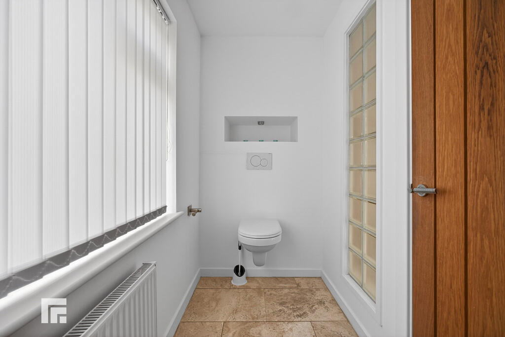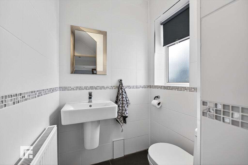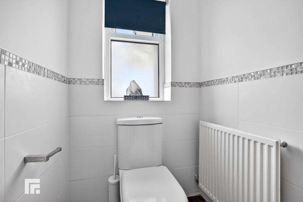 CLOAKROOM Modern white suite comprising low level wc and wash hand basin. Tiled flooring. Full wall tiling. Obscured glass window to front. Under stairs storage cupboard. Radiator.