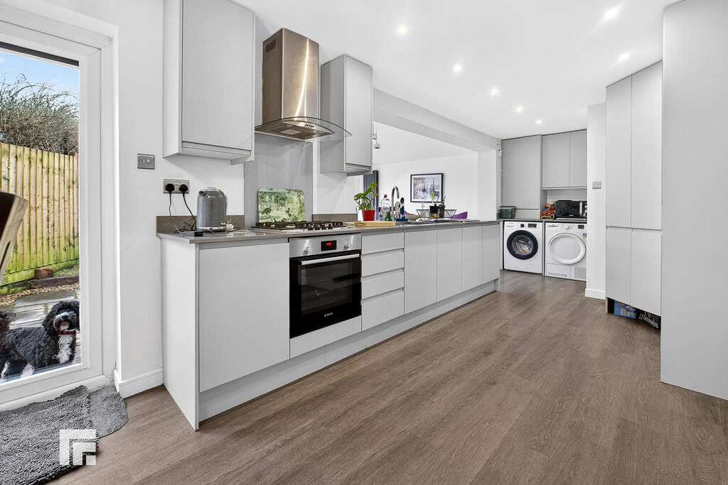 KITCHENANDFAMILYROOM25' 6" x 21' 10"(max) (7.78m x 6.67m) A sizeable kitchen and family room with kitchen well appointed along three sides in light grey matte finish handleless fronts beneath quartz worktop surfaces. Inset stainless steel sink with worktop side drainer. Inset four ring gas hob with curved glass cooker hood above and oven below. Large matching corner pantry cupboard. Integrated fridge freezer. Plumbing for washing machine. Space for tumble dryer. Concealed 'Baxi Duo Tec' combi gas central heating boiler. Ample space for family dining table. French doors to the rear paved patio. The family room has ample space for family seating along with worktop breakfast bar. Window to side. Velux window to rear pitch. Tri folding doors leading to the rear garden. Door to cloakroom. Two radiators.