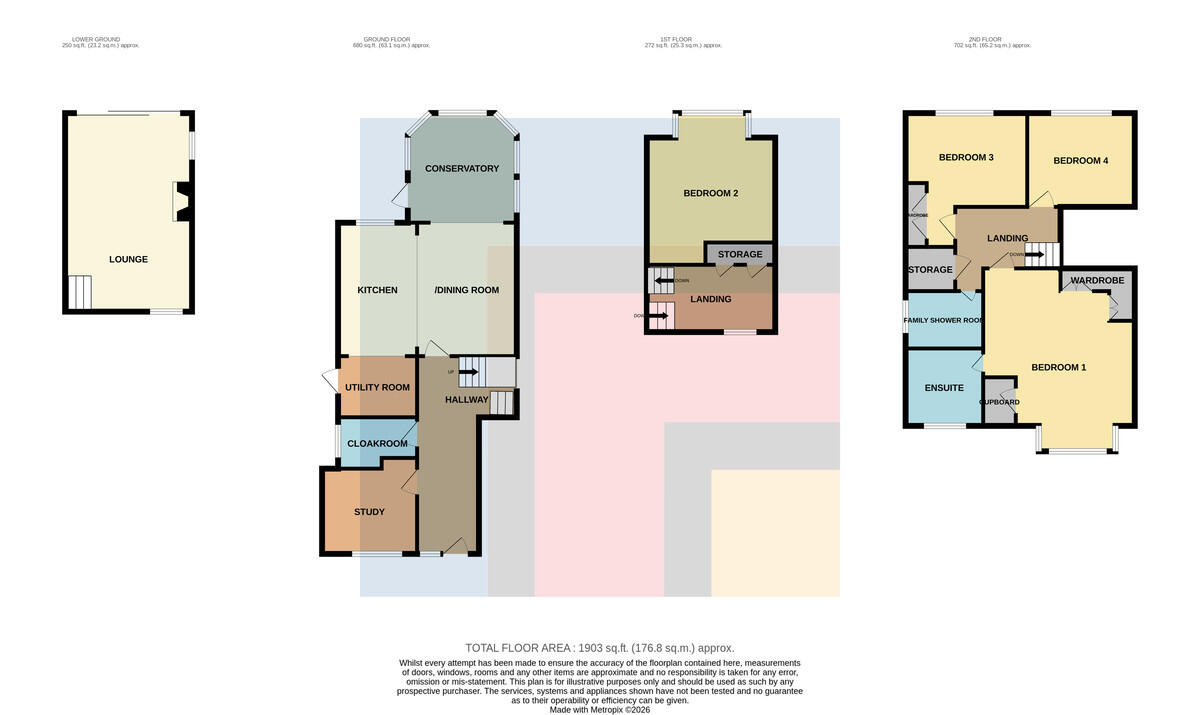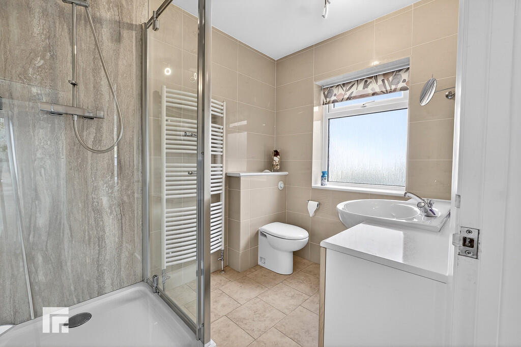 FAMILYSHOWERROOM7' 10" x 5' 10" (2.40m x 1.78m) White suite; low level WC, wash hand basin with chrome mixer tap and vanity, shower cubicle with dual headed chrome shower, panelled splashbacks and glass screen. Shaving point. Cream heated towel rail. Tiled walls. Tiled flooring. Obscured glass window to side.