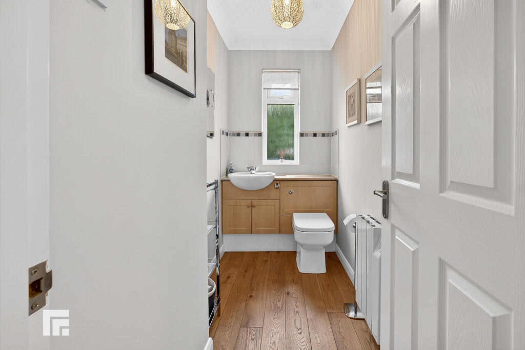 CLOAKROOM7' 11" x 4' 0" (2.42m x 1.24m) White suite, combined low level WC with bowl wash hand basin, chrome mixer tap and vanity. Electric radiator. Tiled splashback. Solid oak flooring. Obscured glass window to side.