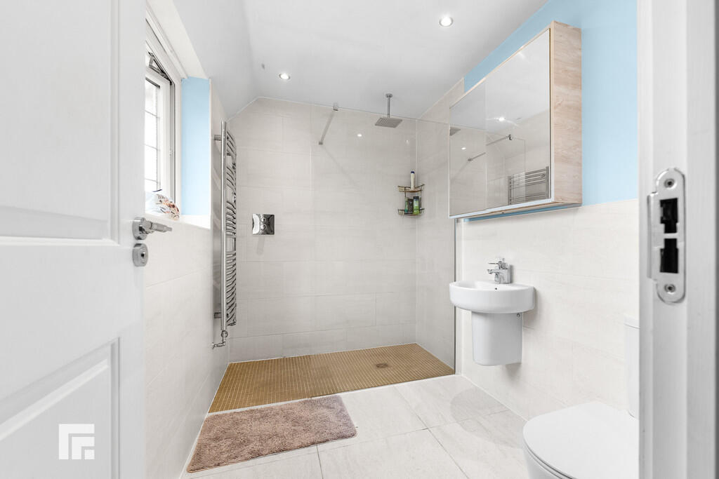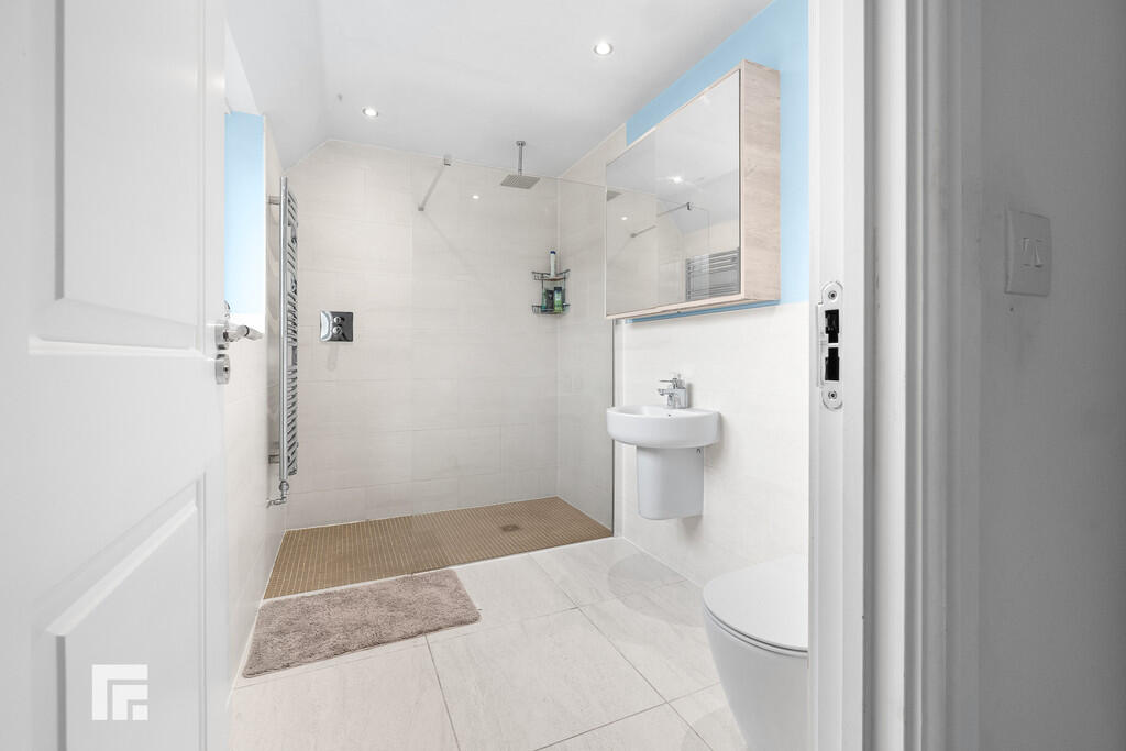 ENSUITESHOWERROOMTWO7' 7" x 4' 3" (2.32m x 1.30m) Modern white suite comprising low level wc, wash hand basin, large shower cubicle with chrome shower above. Tiled splashback. Extractor fan. Obscured glass window to rear. Chrome heated towel rail.