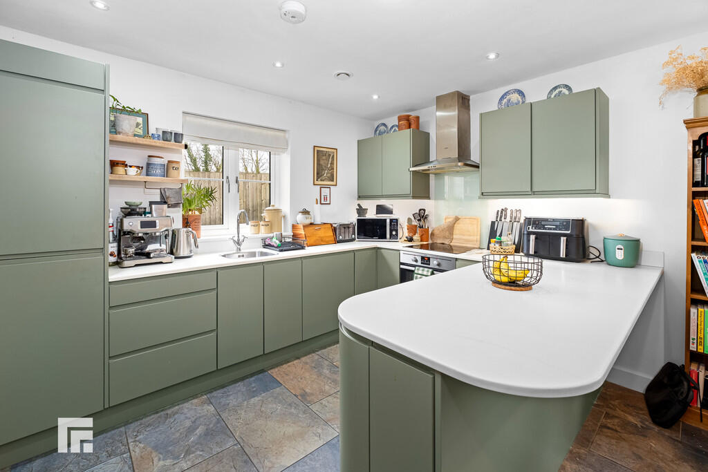 KITCHENANDDININGROOM16' 11" x 11' 6" (5.18m x 3.52m) Well appointed along three sides in sage green matte finish handleless fronts beneath round nosed worktop surfaces. Inset stainless steel sink. Inset four ring electric hob with cooker hood above and oven below. Integrated dishwasher with matching front. Integrated fridge freezer. Matching range of eye level wall cupboards. Worktop breakfast bar. Windows to rear and side. Built in corner seating area with storage below. Slate style flooring with under floor heating.