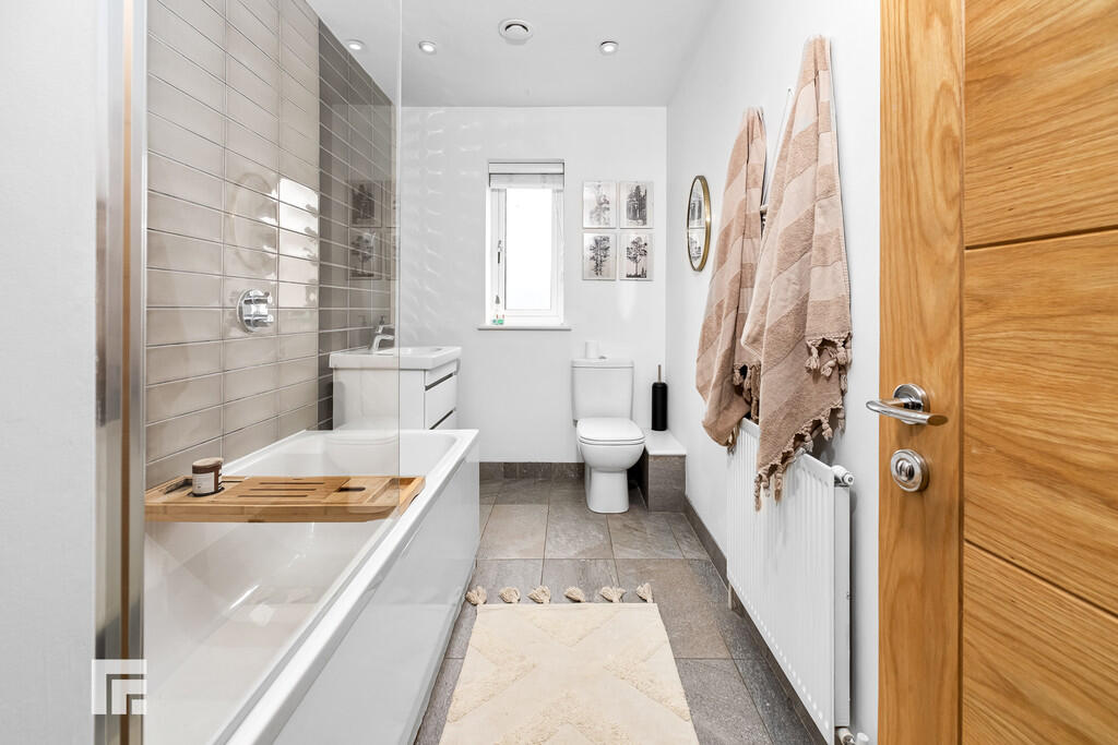 CLOAKROOM Large cloakroom with white suite comprising low level wc, wash basin. Obscured glass window to front. Extractor fan. Recessed spotlights. Quality tiled flooring with underfloor heating.