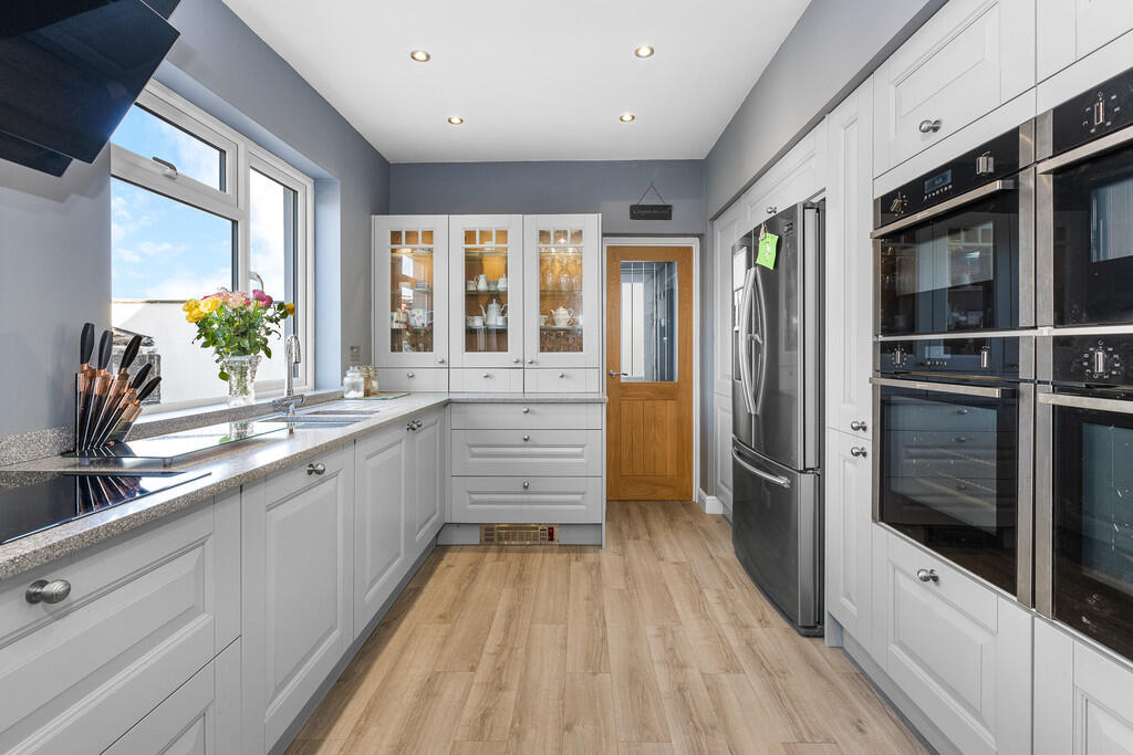 KITCHENANDBREAKFASTROOM19' 1" x 9' 9" (5.84m x 2.98m) Quality modern fitted kitchen well appointed along four sides in light panelled fronts beneath composite stone worktop surfaces. Inset 1.5 bowl sink with worktop side drainer. Inset boiling water tap. Inset five ring 'Neff' induction hob with cooker hood above. Integrated two 'Neff' combi microwave/oven/grill. Integrated slide and hide door 'Neff' ovens. Space for American style fridge freezer. Integrated wine cooler. Worktop breakfast bar. Two windows to rear. Recessed spotlights. Full tiled slate effect wall to one side. Vertical radiator. Door to utility room.