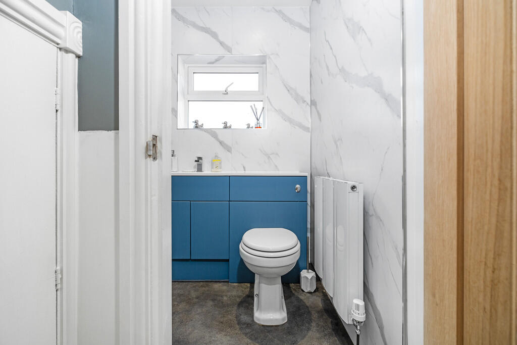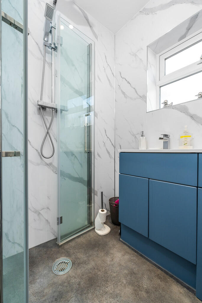 SHOWERROOM Modern white suite comprising low level wc, vanity wash basin, shower cubicle with folding shower screen doors and twin head chrome shower. Acrylic panelled walls. Obscured glass window to side. Radiator.