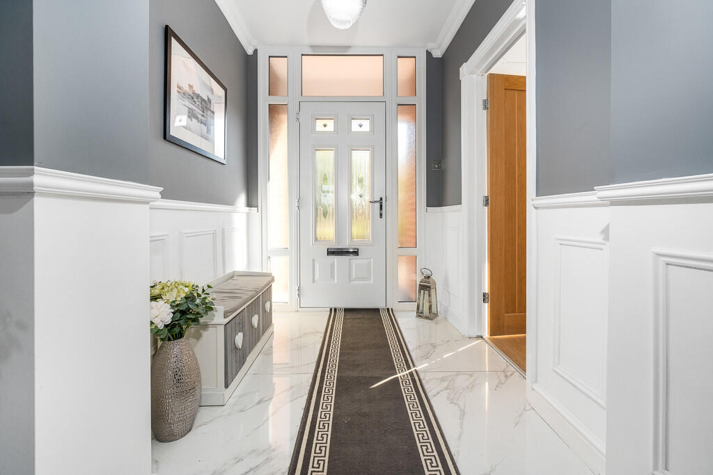 ENTRANCEHALLWAY Approached via a composite entrance door with obscured glass windows to either side leading to the spacious entrance hallway. Staircase to first floor with glass panelled front. Marble effect tiled flooring. Column radiator.
