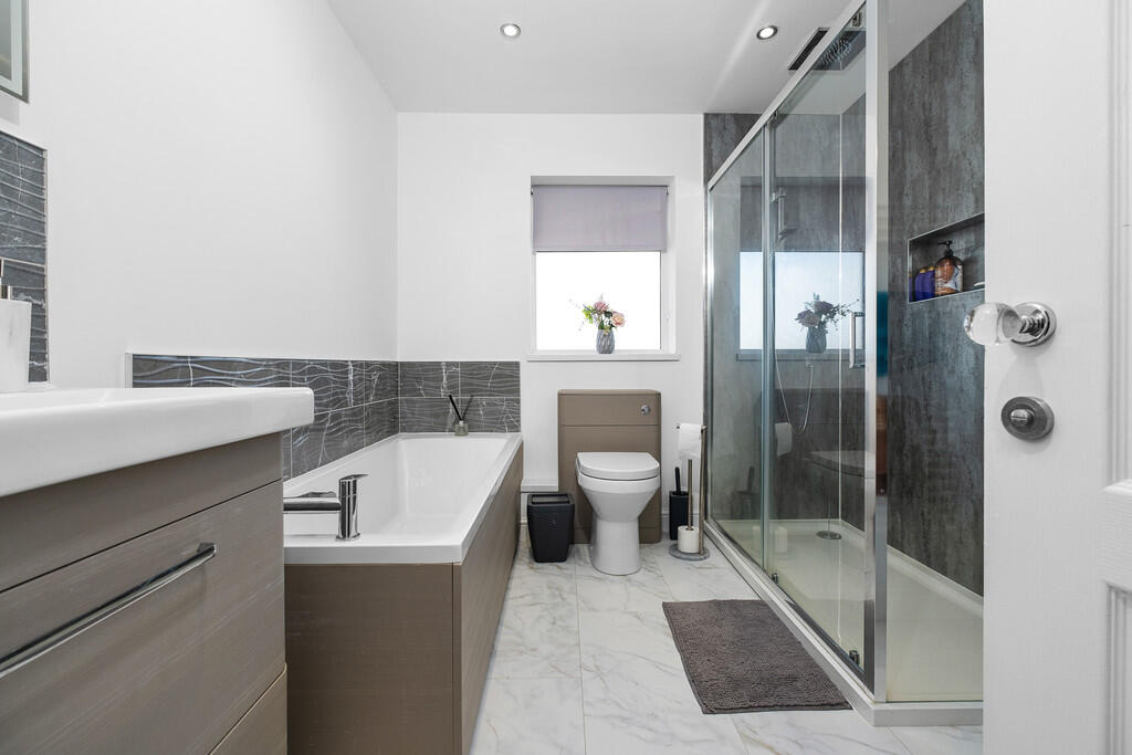FAMILYBATHROOM8' 11" x 8' 0" (2.73m x 2.46m) Modern white suite; low level WC, wash hand basin with chrome mixer tap and vanity; double glass shower cubicle with rainfall shower and additional chrome hand held shower; panelled bath with chrome mixer tap. LED wall mirror. Heated towel rail. Spotlights. Tiled flooring and splashbacks. Panelled splashbacks to shower. Obscured glass window to rear.