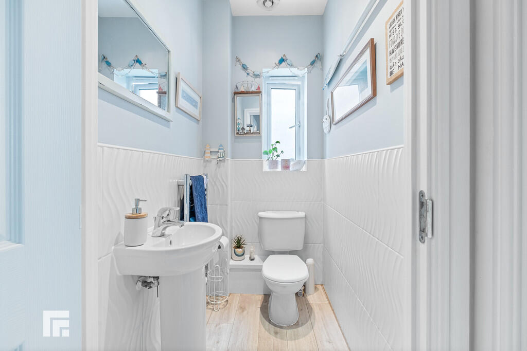 CLOAKROOM White suite comprising low level wc and wash hand basin. Wall tiling to half height. Obscured glass window. Extractor fan. Chrome heated towel rail.