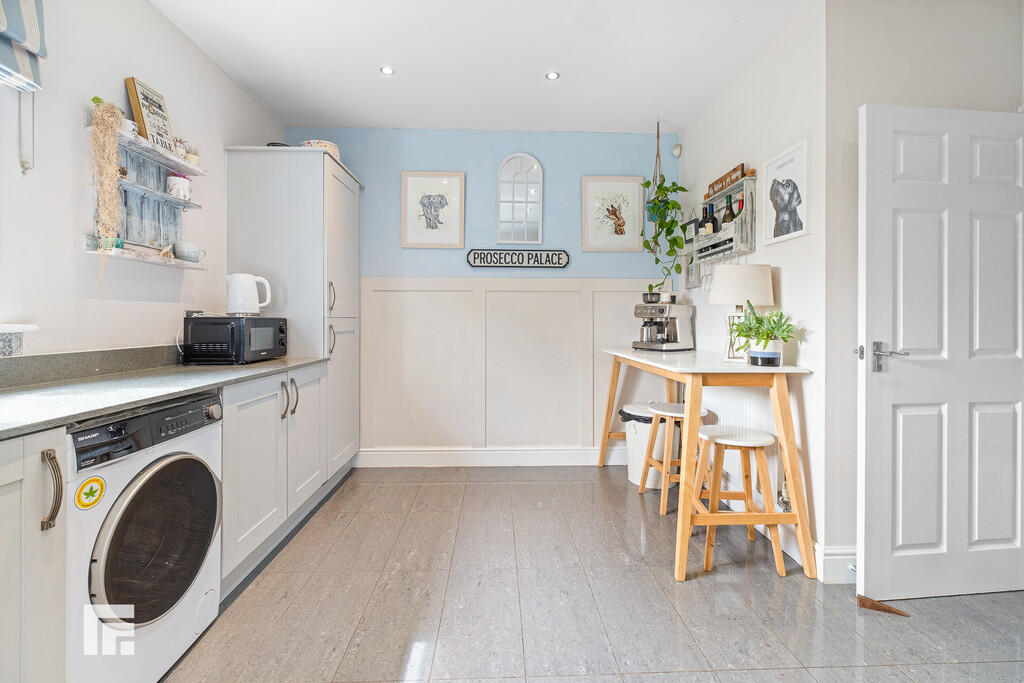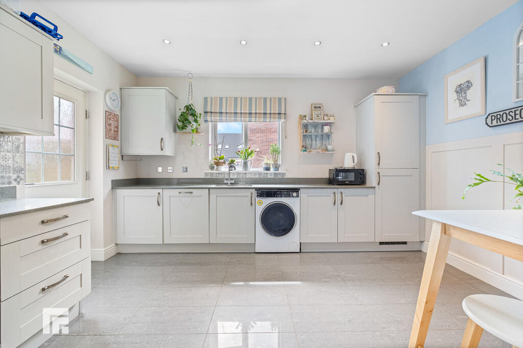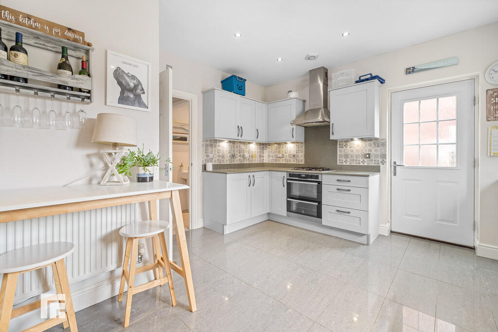 KITCHEN/BREAKFASTROOM13' 8" x 12' 10" (4.19m x 3.92m) A good sized kitchen and breakfast room, well appointed along three sides in woodgrain effect panelled fronts beneath quartz worktop surfaces. Inset 1.5 bowl stainless steel sink with worktop side drainer. Inset four ring gas hob with cooker hood above and oven below. Integrated dishwasher. Plumbing for washing machine. Integrated fridge freezer. Concealed 'Glow Worm' combi gas central heating boiler. Ample space for family breakfast table or breakfast bar. Window to side. Recessed spotlights. Quality tiled flooring. Matching range of eye level wall cupboards. Door to rear. Radiator.