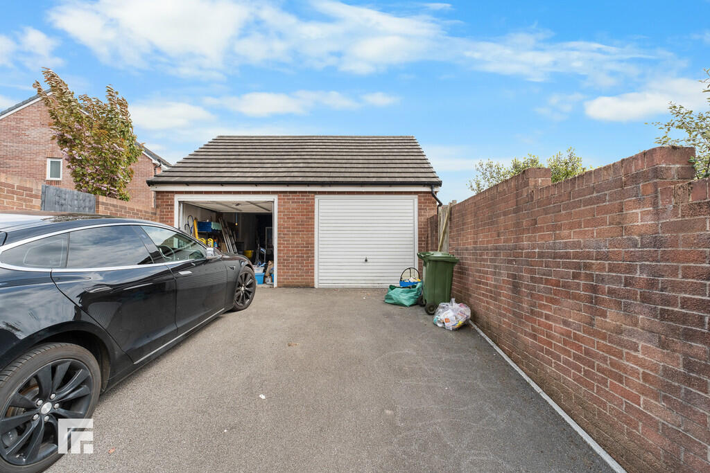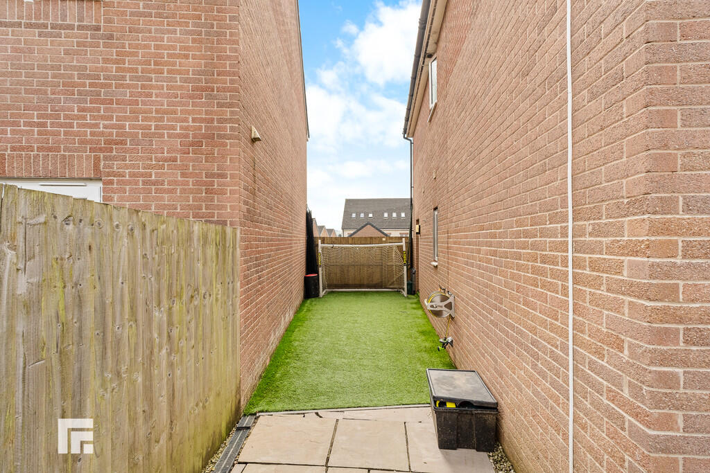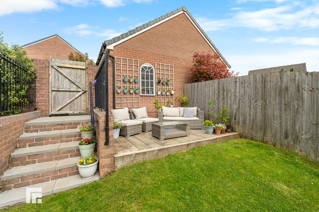 REARGARDEN A delightful rear garden having been beautiful landscaped with large paved patio and area of lawn with neat borders of plants and shrubs. To the far end is a decked relaxation area and timber gate to driveway and garage. To the rear is an area of artificial lawn. Enclosed garden with brick wall to front & side and timber fence to rear boundary. Additional gate giving side access to cul de sac. Outside power. Outside lights. Outside tap.