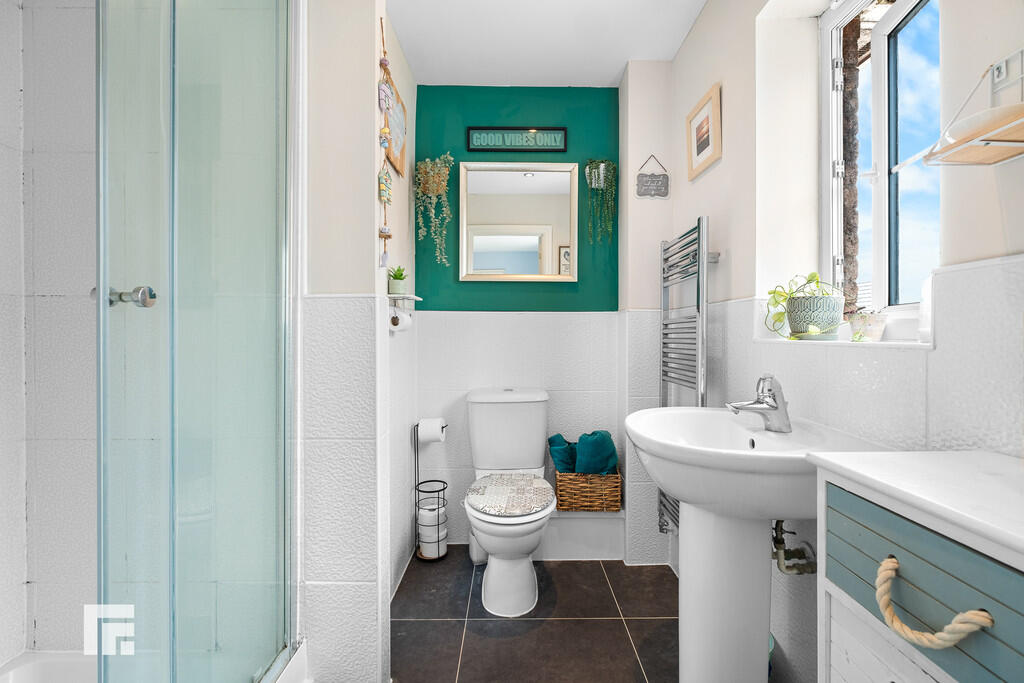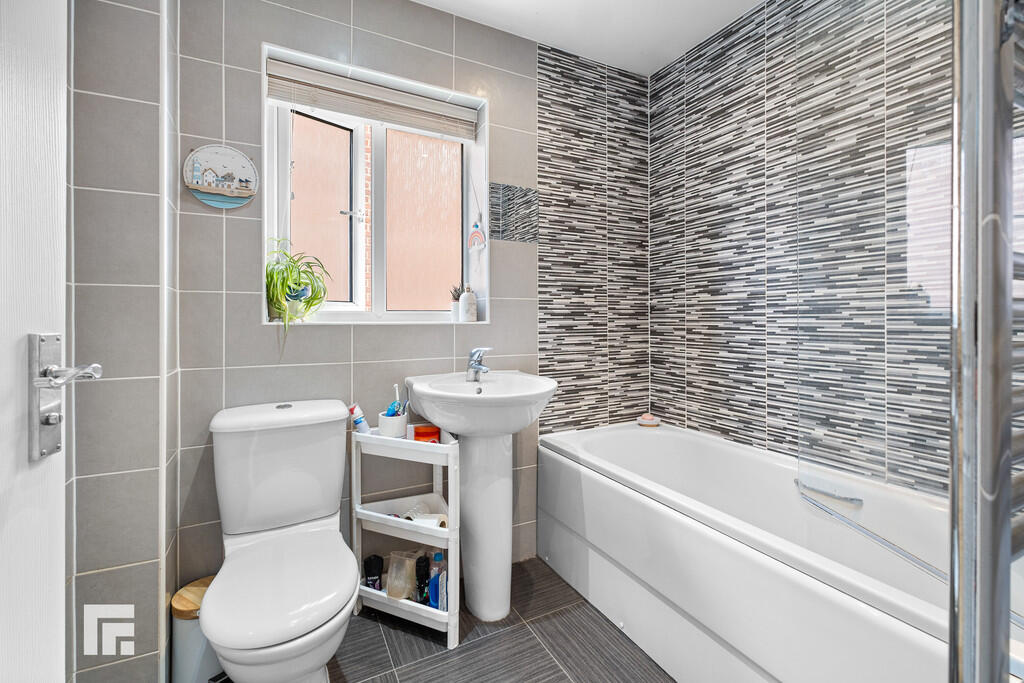 FAMILYBATHROOM7' 2" x 5' 6" (2.20m x 1.68m) Modern white suite comprising low level wc, wash hand basin, panelled bath with shower above and swivel shower screen. Full wall tiling. Obscured glass window to side. Tiled flooring. Recessed spotlights. Extractor fan. Chrome heated towel rail.