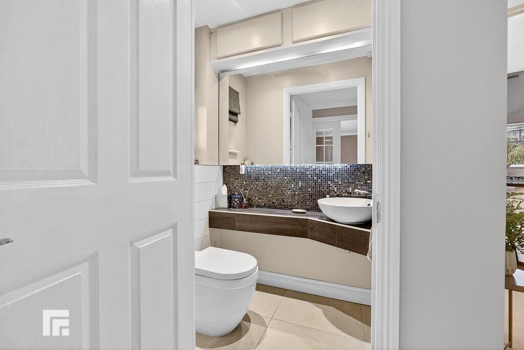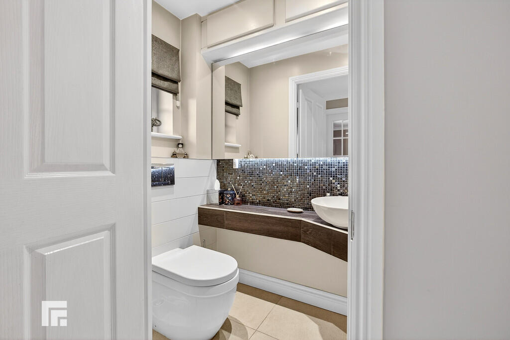 CLOAKROOM Quality white suite comprising low level wc and bowl style wash hand basin. Mosaic tiled splash back. Tiled flooring. Obscured glass window to front. Radiator.