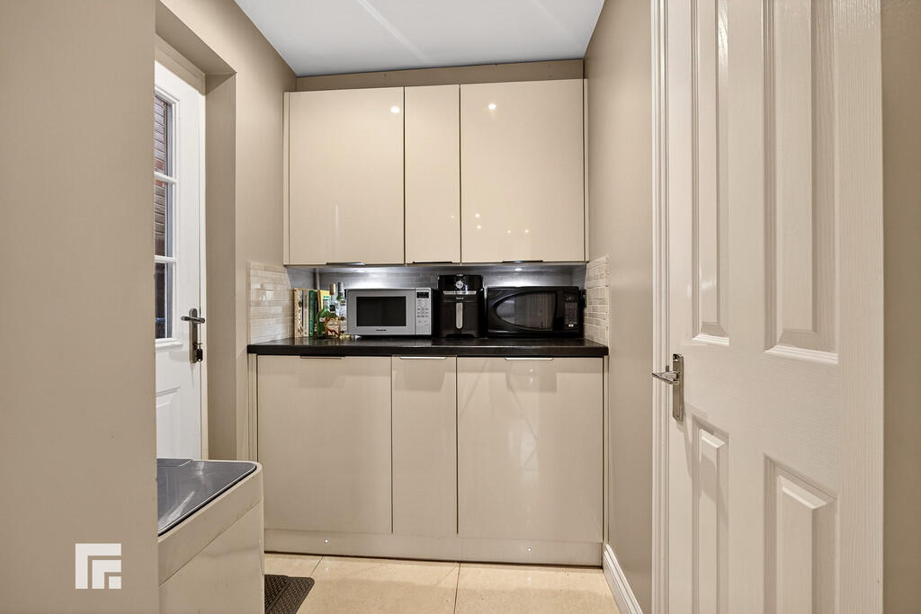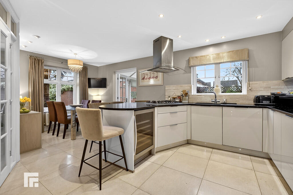 KITCHENANDDININGROOM19' 6" x 11' 11" (5.96m x 3.64m) Well appointed along three sides in light high gloss fronts beneath granite worktop surfaces. Inset 1.5 bowl stainless steel sink with worktop side drainer. Inset five ring gas hob with curved glass cooker hood above. Neff integrated double oven and microwave and grill with plate warming drawer below. Space for fridge freezer. Integrated Miele dishwasher Matching range of eye level wall cupboards. Granite worktop peninsula island. Under counter wine cooler. Pull out pantry cupboard. Ample space for large family dining table. Tiled splash back to kitchen area. Windows to front and side. Tiled flooring. Double doors to conservatory. Opening to utility room. Two radiators.