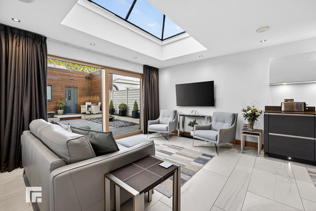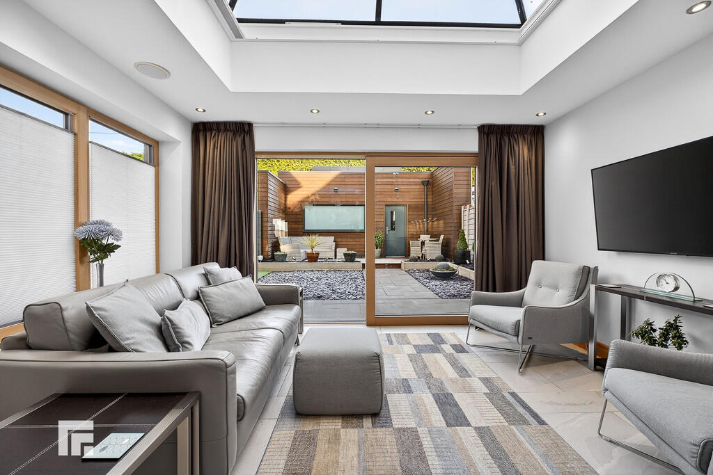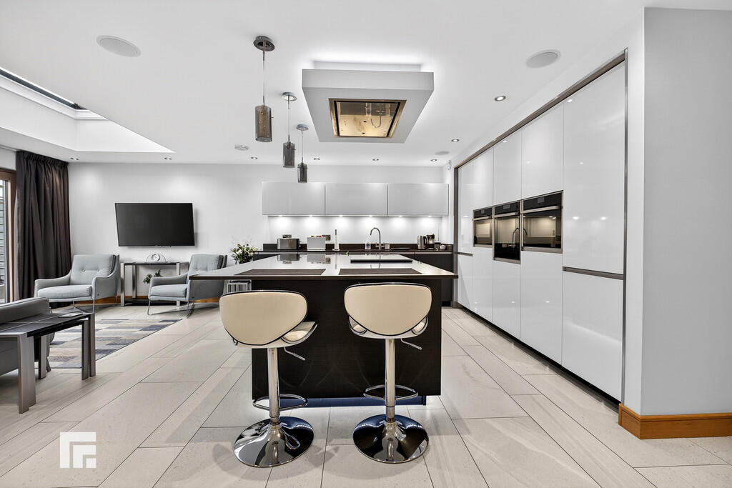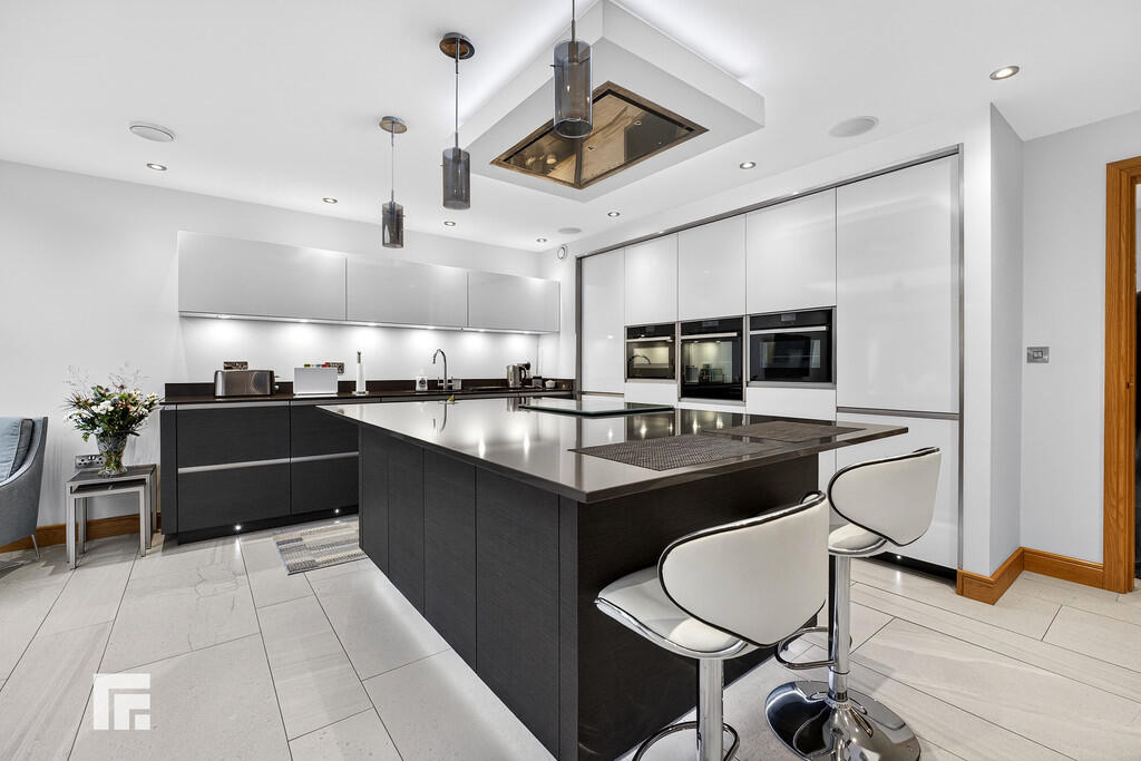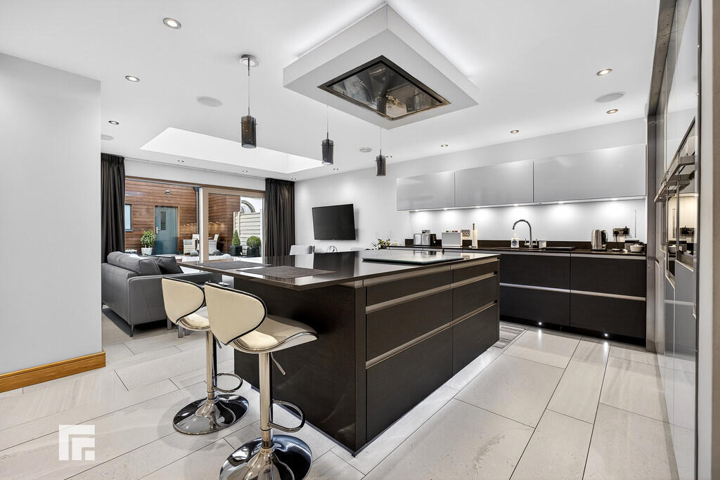 OPENPLANKITCHENANDFAMILYROOM23' 0" x 17' 6" (7.03m x 5.34m) A beautifully appointed open plan kitchen fitted with a quality German kitchen (Rational) with Silestone quartz worktops. The kitchen is further complemented by a feature glazed rooflight. Well designed with central island housing 'Neff' induction hob with extractor above and built in units beneath. A range of further fitted wall, base and drawer units, built in appliances to include 'Neff' conventional oven, steam oven and microwave. Integrated dish washer, large fridge and separate freezer. Porcelain tiled floor. Window to the side with full width doors leading to delightful landscaped rear garden.