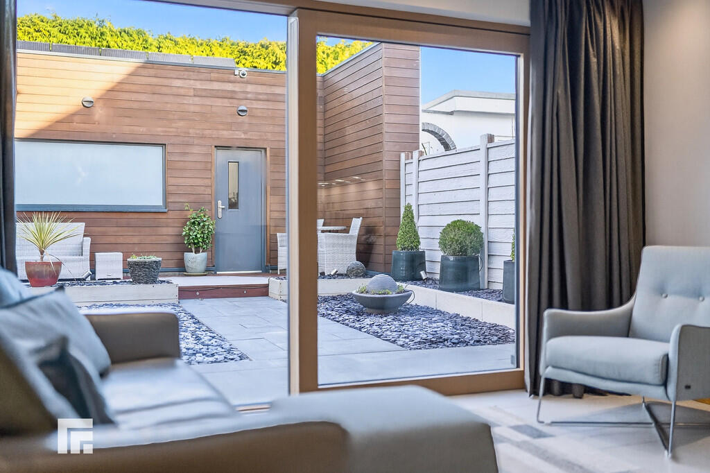 REAR The rear garden is designed with a high quality low maintenance artificial grass, slate chippings and Millboard woodgrained decking with lighting and various lights to compliment the overall effect including electrical provision for any water features to be added. Enclosed by composite fence to one side. There is a screened storage area behind the garage for refuse/bins which is used by the property but not owned. External power sockets.