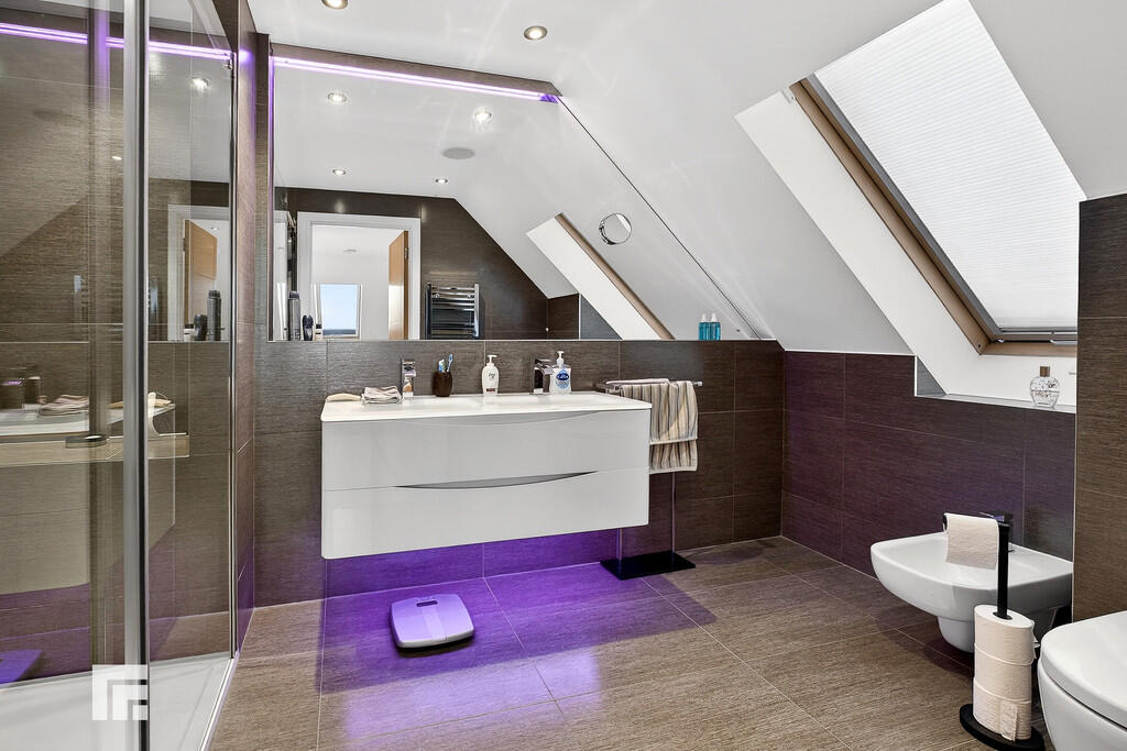 ENSUITE11' 4" x 6' 10" (3.47m x 2.09m) Impressive primary en-suite fully tiled with double shower and glass sliding doors, twin glass wash hand basins set in vanity unit, low level wc with concealed cistern and bidet. Fitted mirror to one wall. Roof window to side pitch.