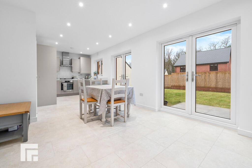 KITCHEN/BREAKFASTROOM/FAMILYROOM11' 2" x 25' 5" (3.41m x 7.76m) A modern kitchen fitted with a range of base and eye level units incorporating one and a half bowl sink with complementary marble effect work surfaces. Fitted gas electric oven with gas hob and extractor hood over. Integrated fridge/freezer, dishwasher and washer/dryer. uPVC double glazed window and two sets of French patio doors leading to south facing rear garden. Tiled flooring. Radiator. Spotlights.