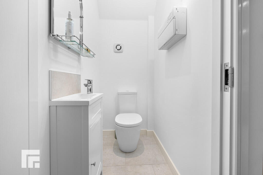 CLOAKROOM Fitted with low level WC and vanity enclosed wash hand basin. Tiled flooring and splash back. Radiator. Extractor fan.