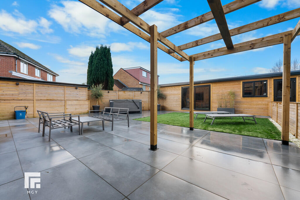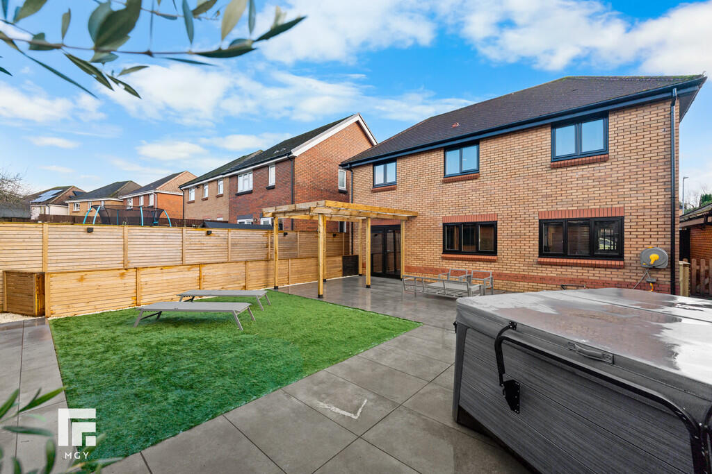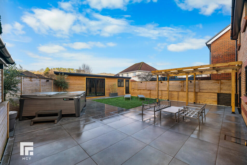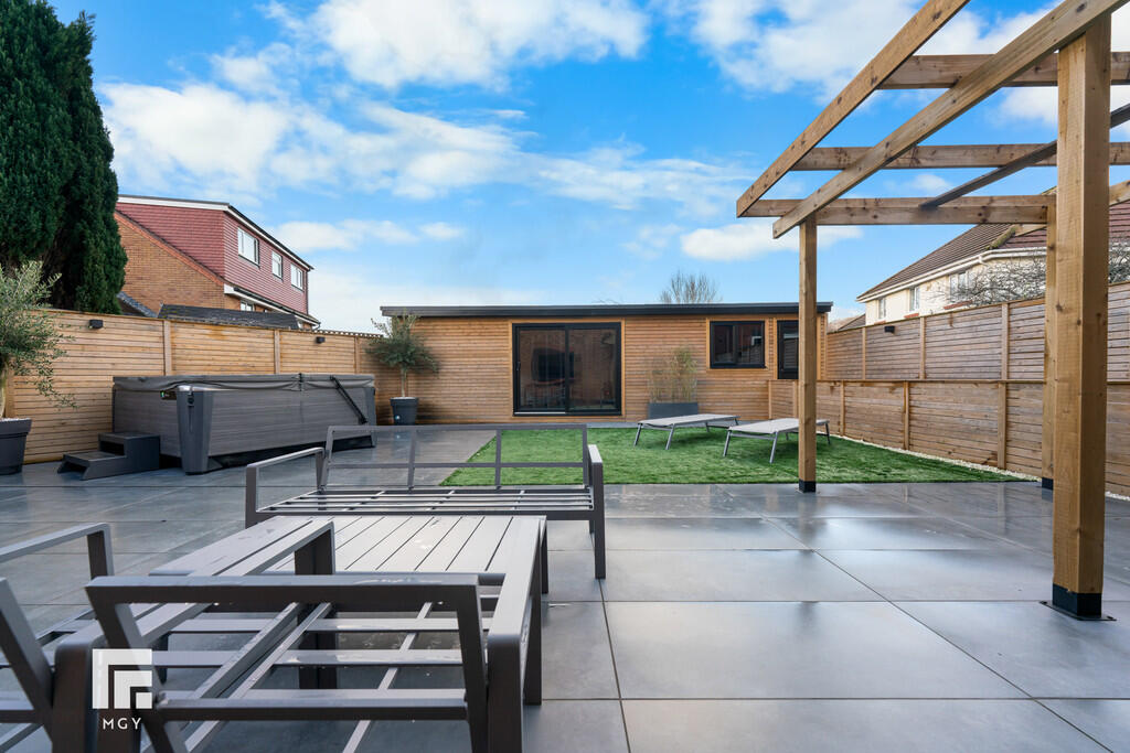 REARGARDEN A landscaped rear garden with large paved patio and artificial lawn. Gated access to both sides. Boundary fence and lighting. Outside tap. Garden shed. Access to garden room.